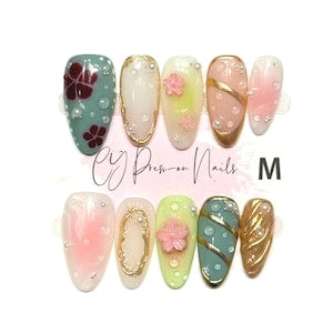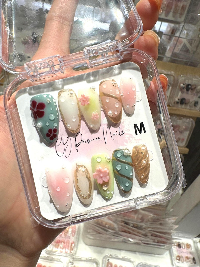 3D Brown Sakura Floral Garden Gold Plating Medium Almond Nails Premium Salon-quality Reusable Handmade Press-on Nail Easy Use Fake Nails
