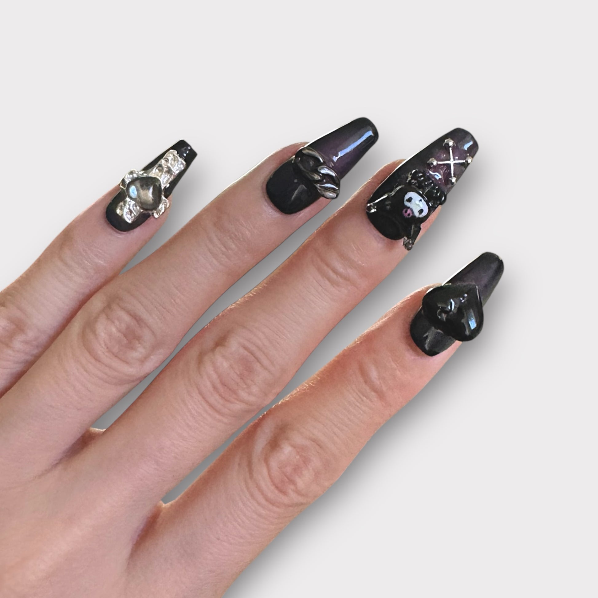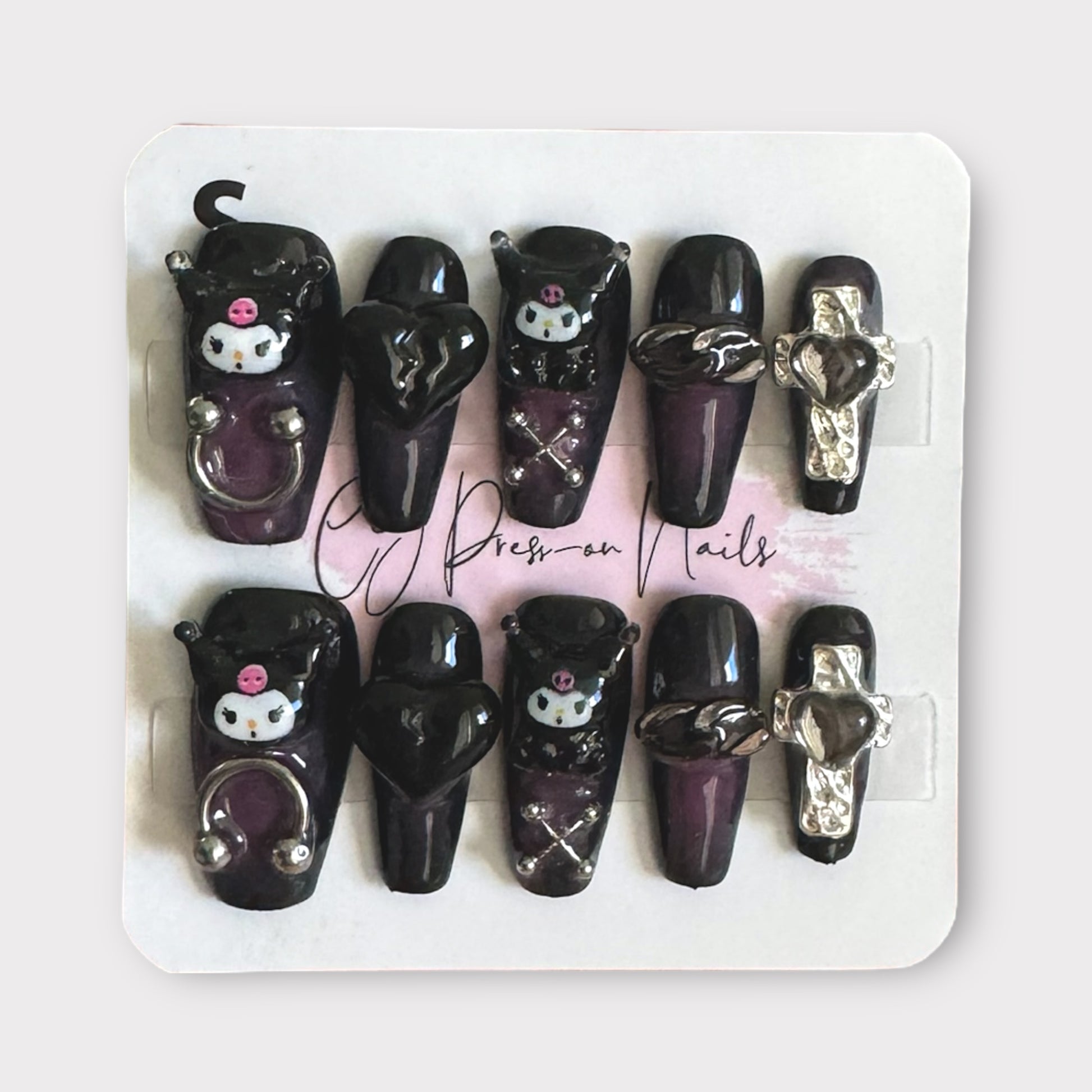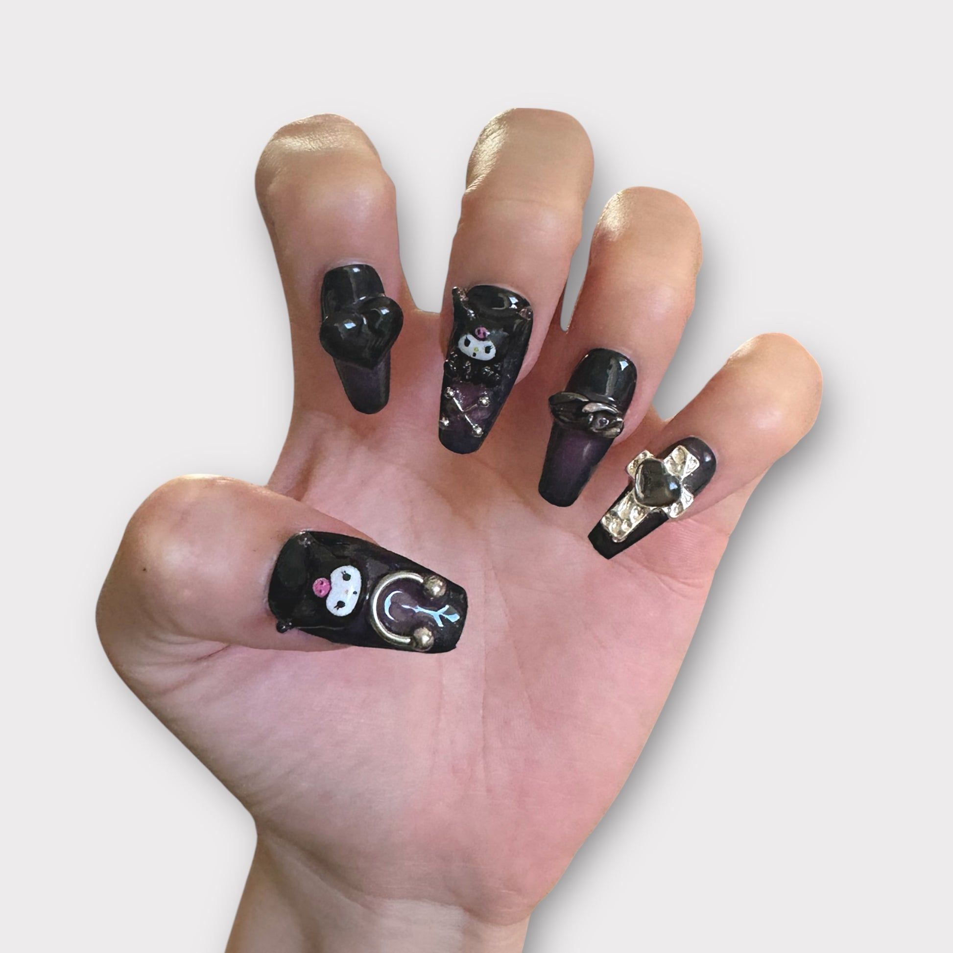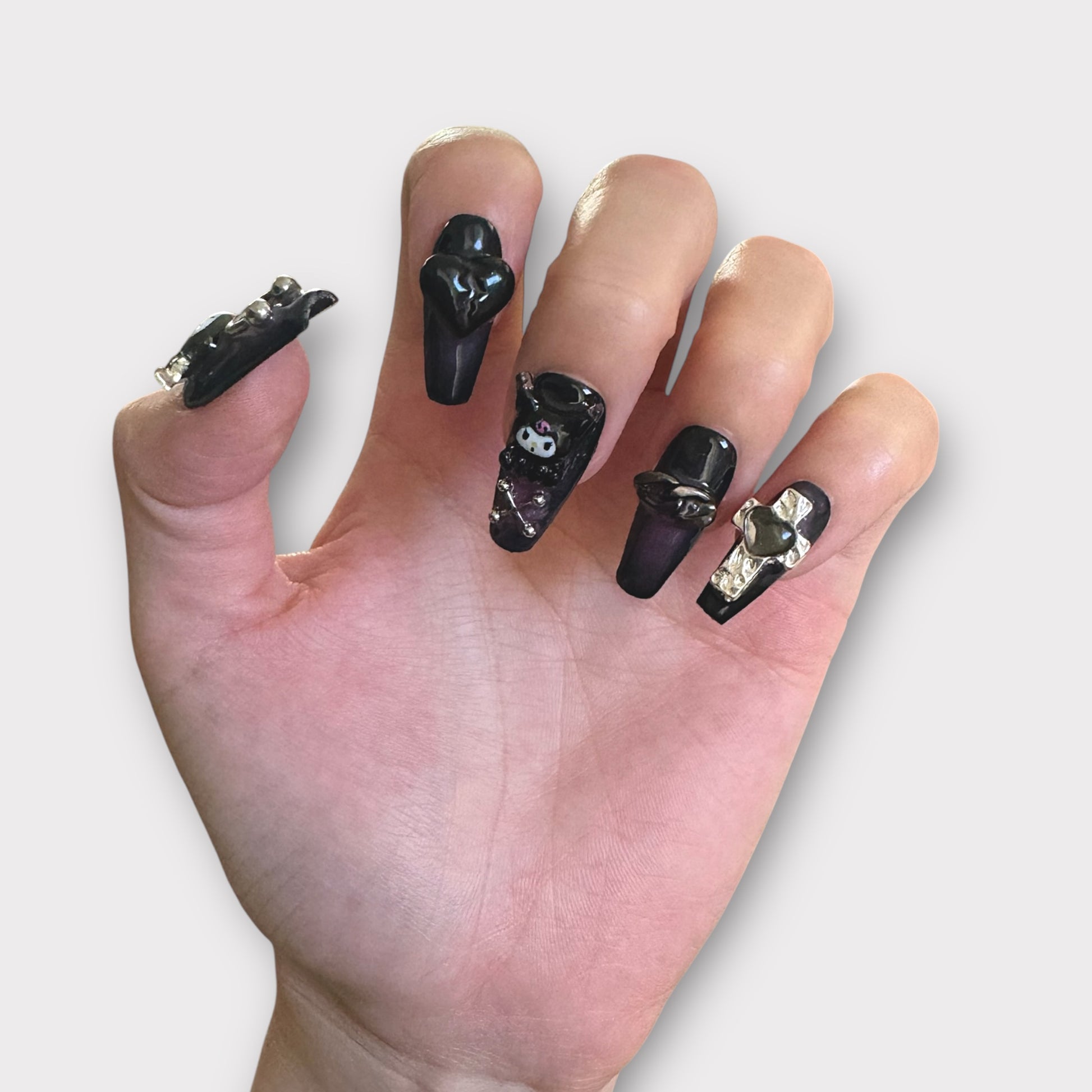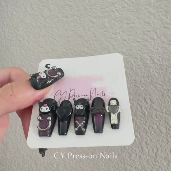 3D Dark Purple Kuromi with Charms Coffin-shape Cute Salon-quality Reusable Handmade Press-on Nails