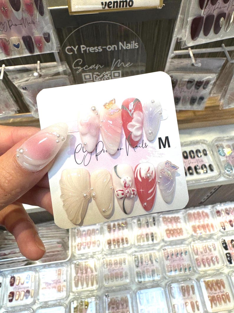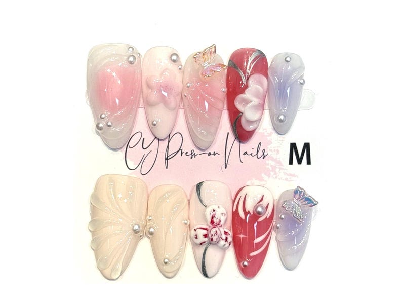 3D Hot Pink Flower with Butterfly Vacation Nails Temporary/Long term Use Nails Medium Almond Salon-quality Reusable Handmade Press-on Nails
