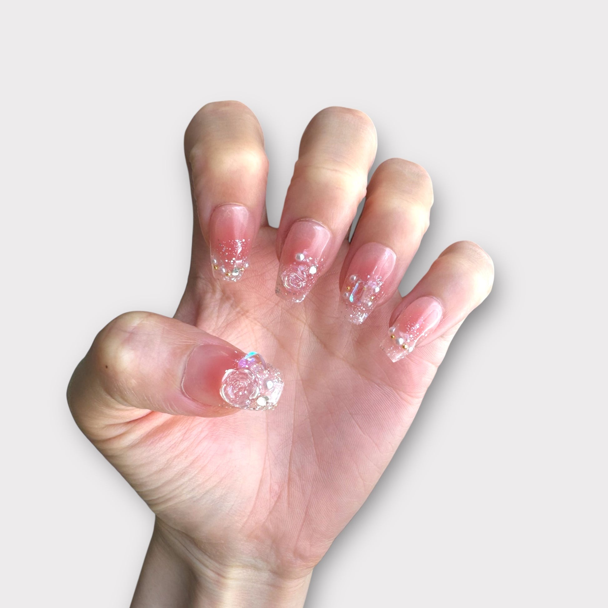 3D Pink Roses Flowers Butterflies Romantic Holiday Cute Jelly Extra Short Medium Coffin shape Salon-quality Reusable Handmade Press-on Nails