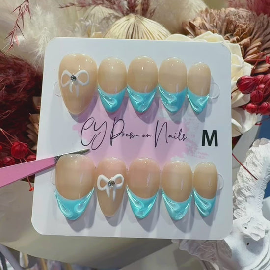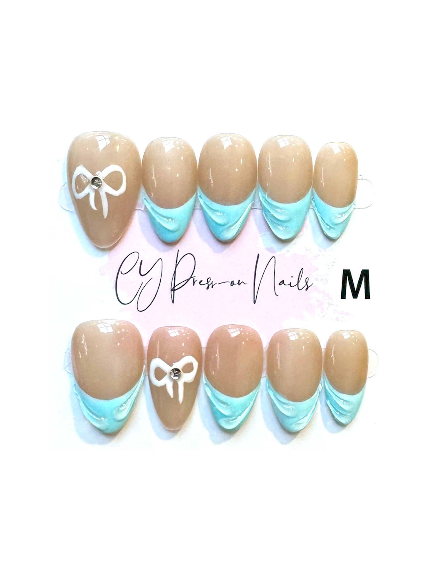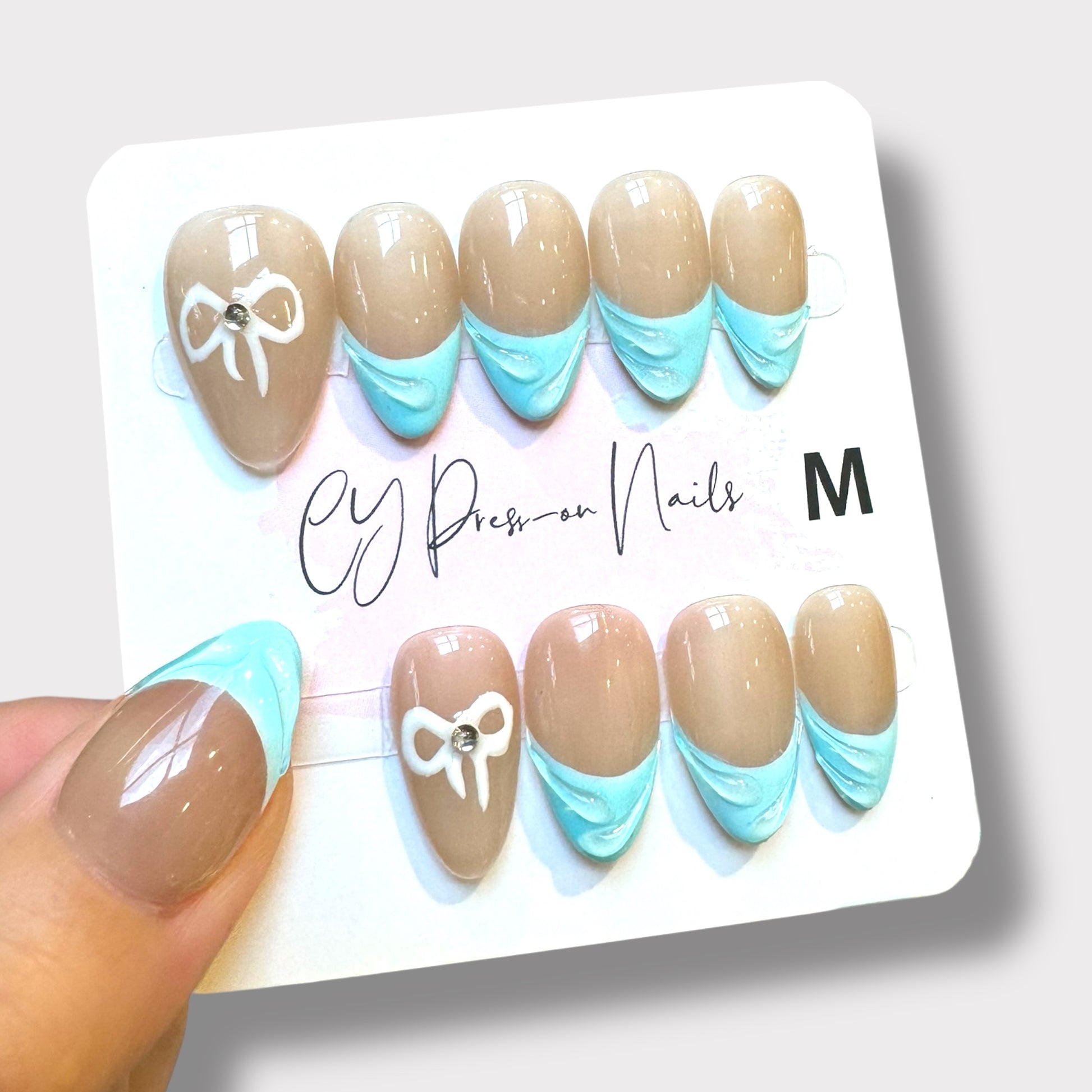 A sweet nude-and-aqua press-on nail set featuring glossy nude bases, 3D draped aqua tips, and cute white ribbon accents with crystal details. This soft, feminine design adds a fresh pop of color—perfect for everyday wear, spring looks, or anyone who loves playful, clean-girl aesthetics. Handcrafted for a smooth fit and long-lasting shine.