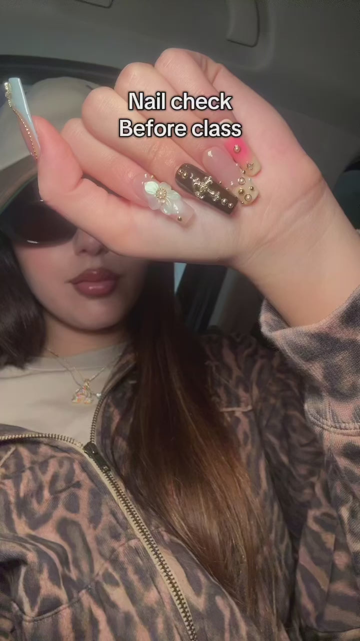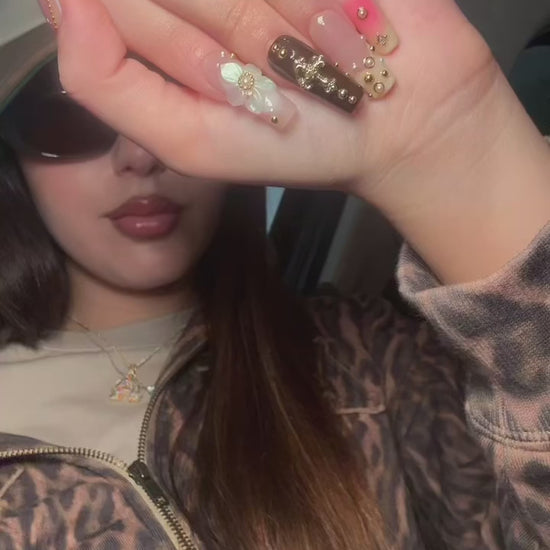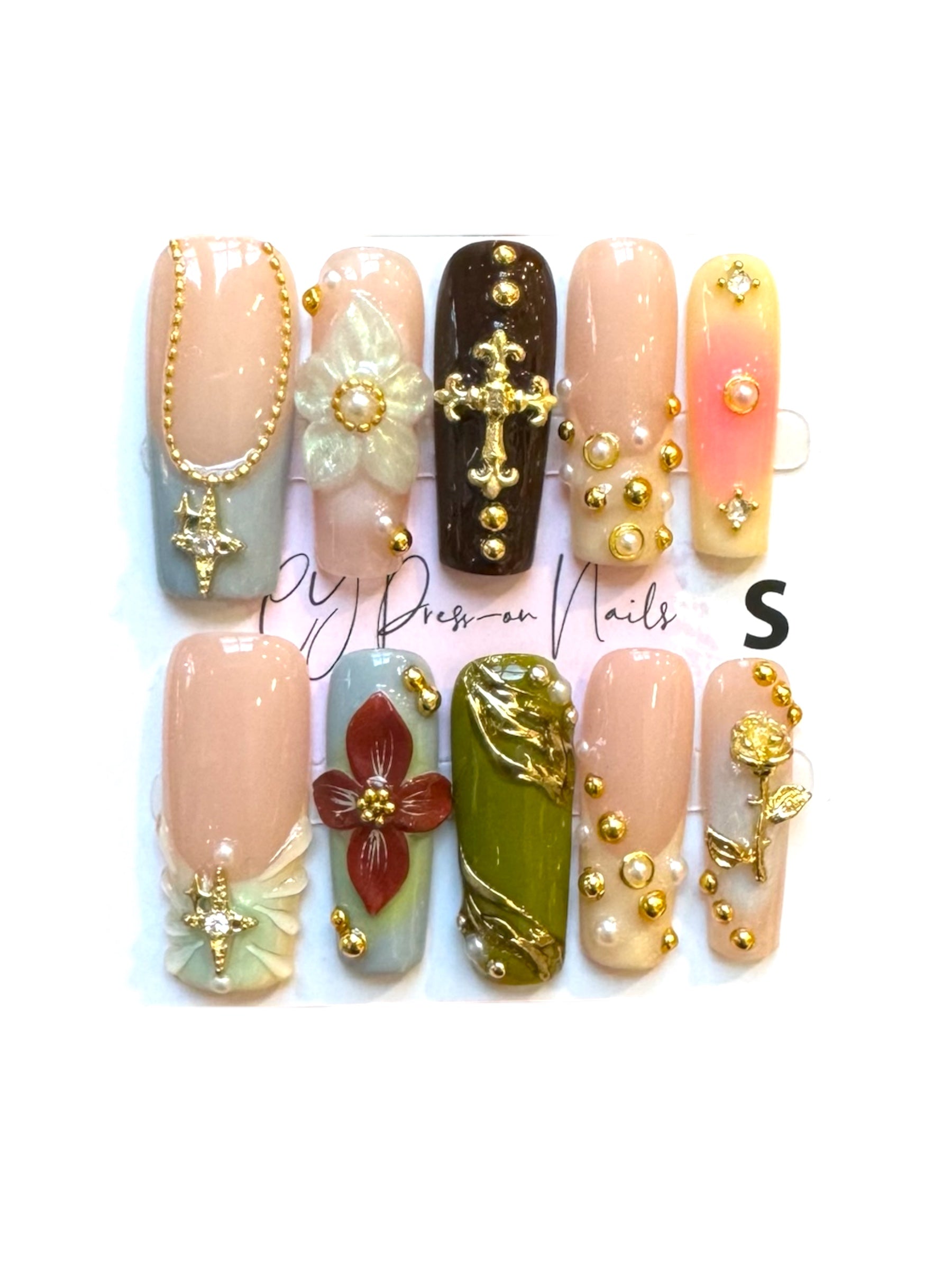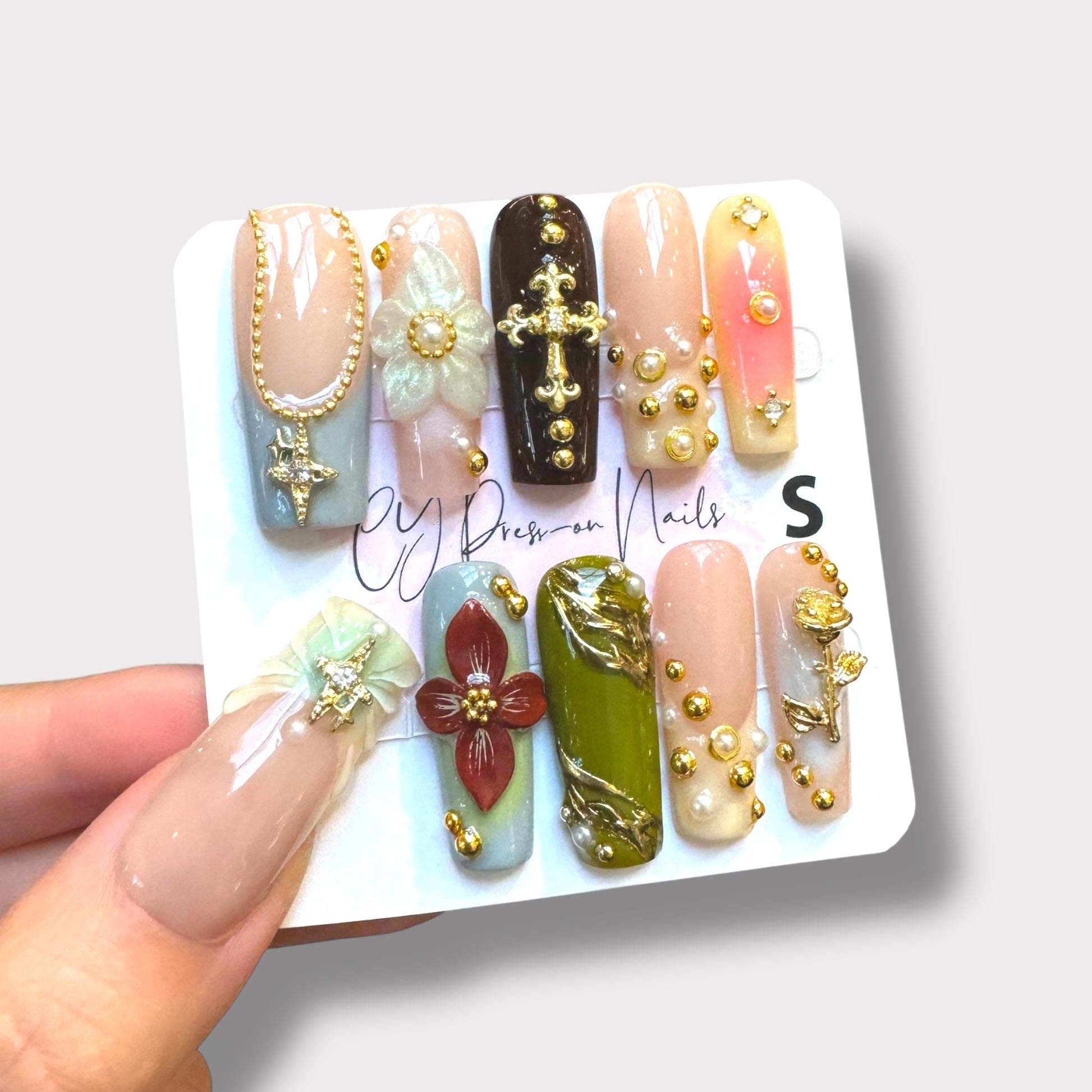 This luxury handmade press-on nail set combines gothic elegance and floral grace. Featuring deep olive and burgundy accents, 3D flowers, gold crosses, and pearl embellishments, each nail tells a story of vintage romance and divine beauty. The mix of nude and jewel tones with ornate metallic charms makes this set perfect for bold, fashion-forward looks — ideal for special occasions, photo shoots, or statement everyday wear.