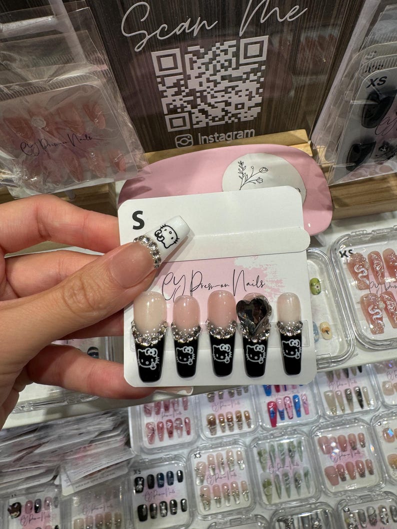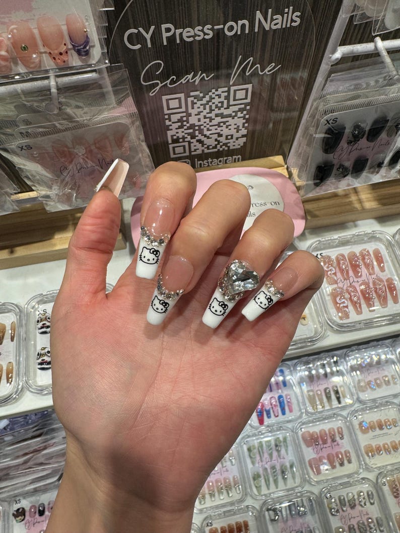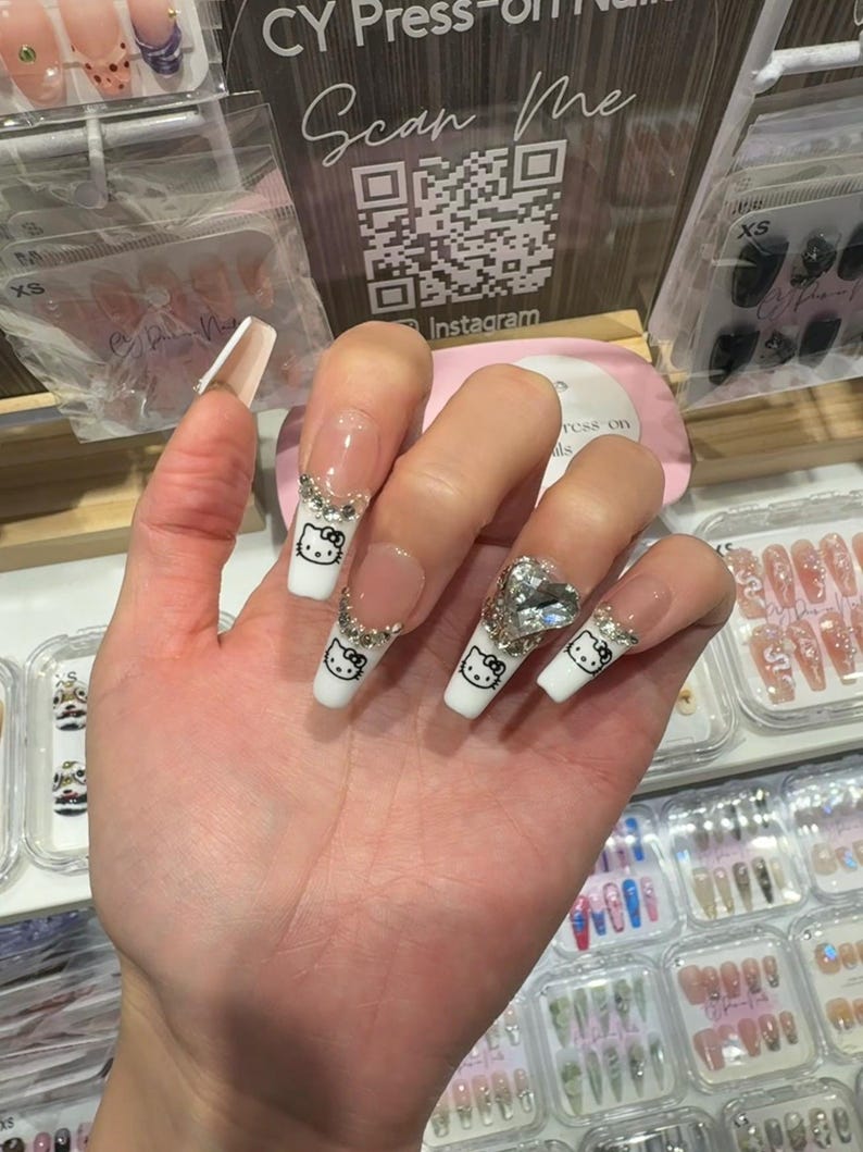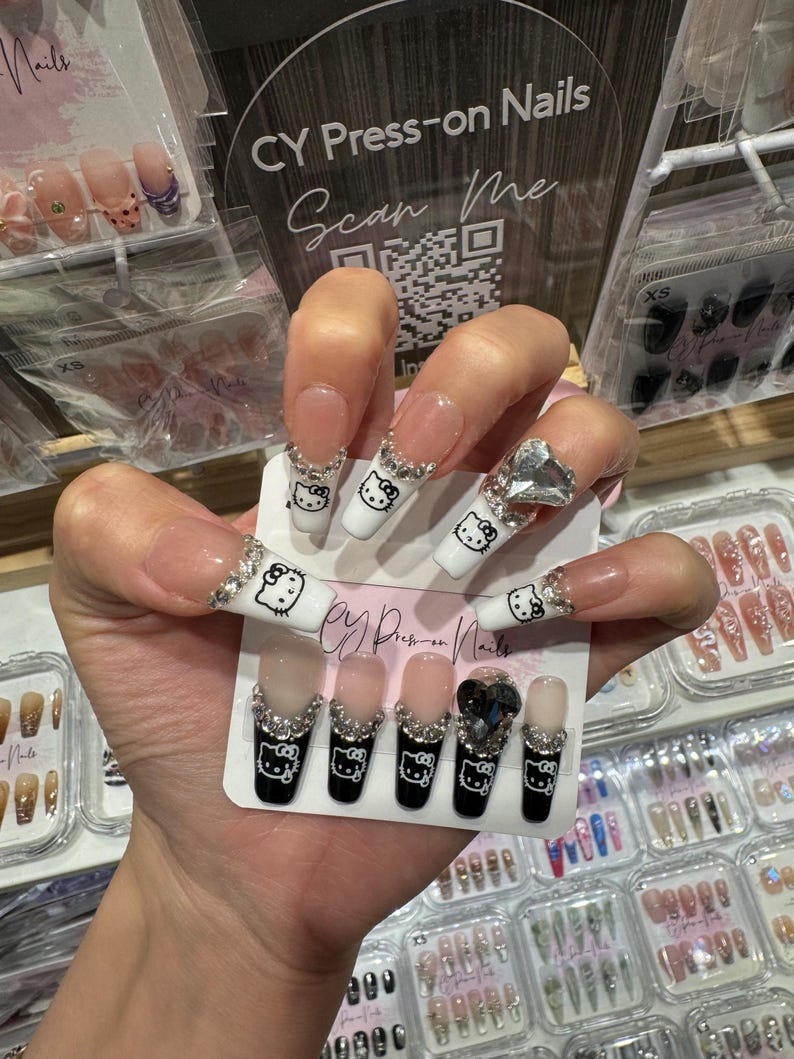 Black and White Hello Kitty French Tips with Charms Medium Long Coffin Salon-quality Reusable Handmade Press-on Nails
