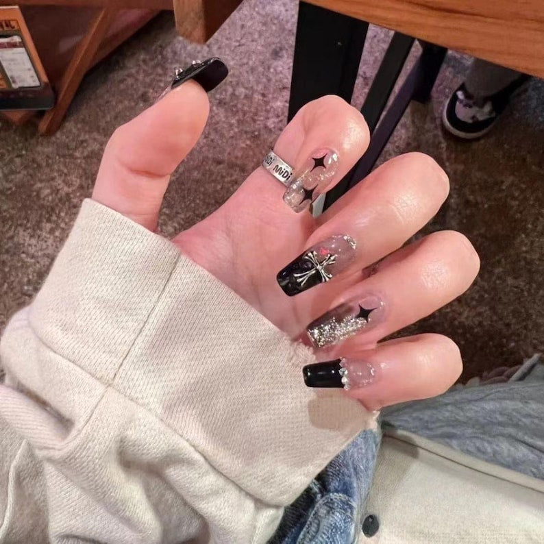 Black Chrome Hearts Dark French Tips with Star Pigment Medium Coffin with Diamonds Reusable Salon-quality Handmade Press-on Nails