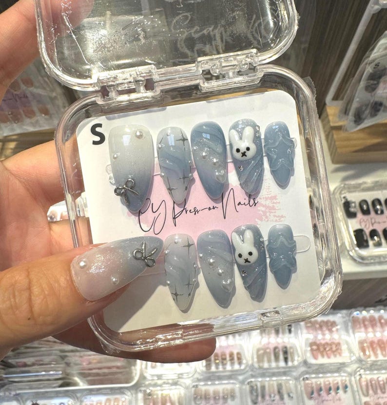 Blue Pink Miffy Cartoon Nails with Bunny 3D Design Medium Almond Nails Salon-quality Reusable Handmade Press-on Nails Easy Apply DIY NAILS