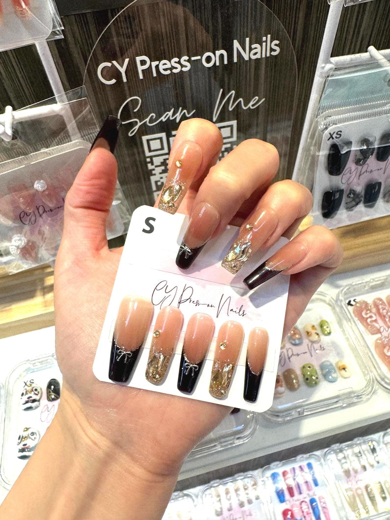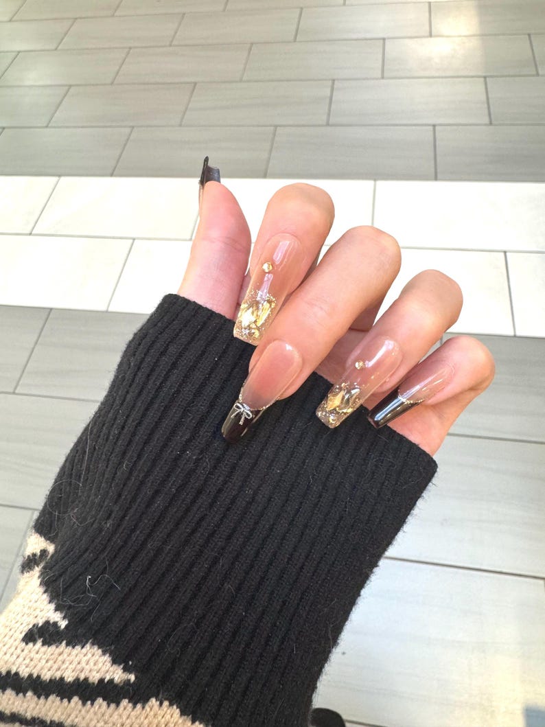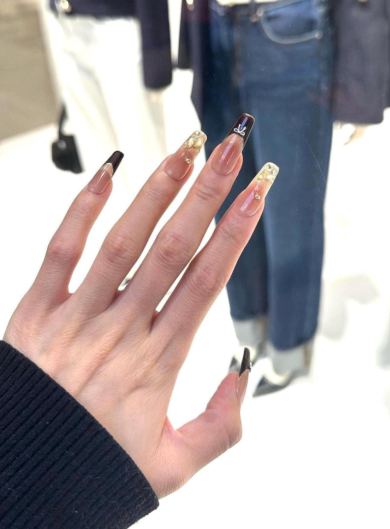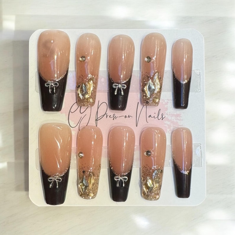 Crystal Gold Bronze French Tips with Bows Winter Dark Brown Long Coffin Salon-quality Reusable Handmade Press-on Nails