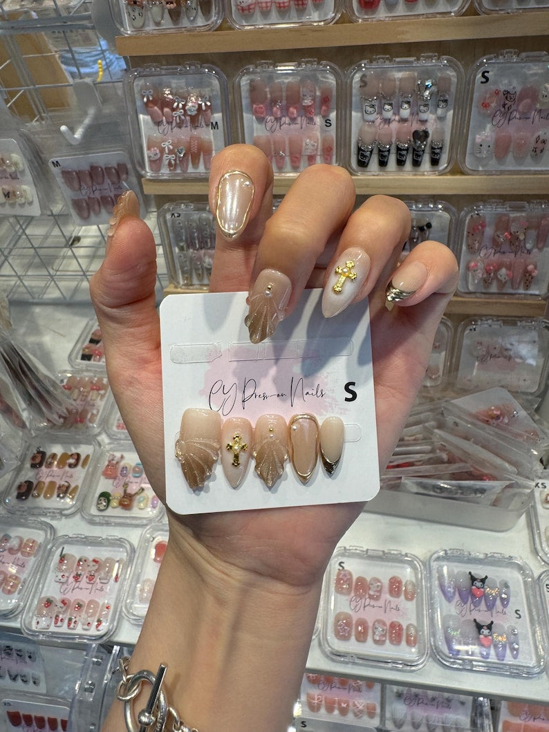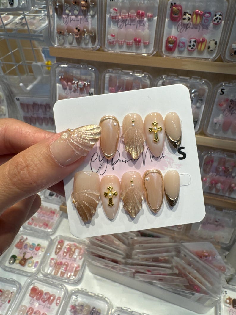 Gilded Gold Neutral 3D Water Wave Press-On Nails – Medium Almond Shape | Handmade, Reusable, Salon-Quality | Free Glue Included