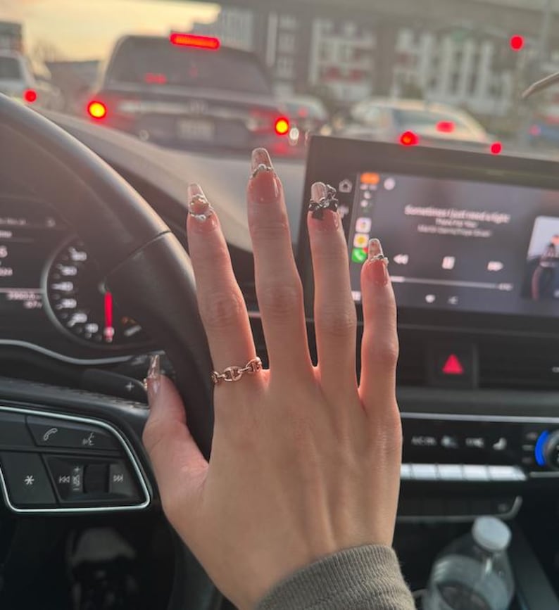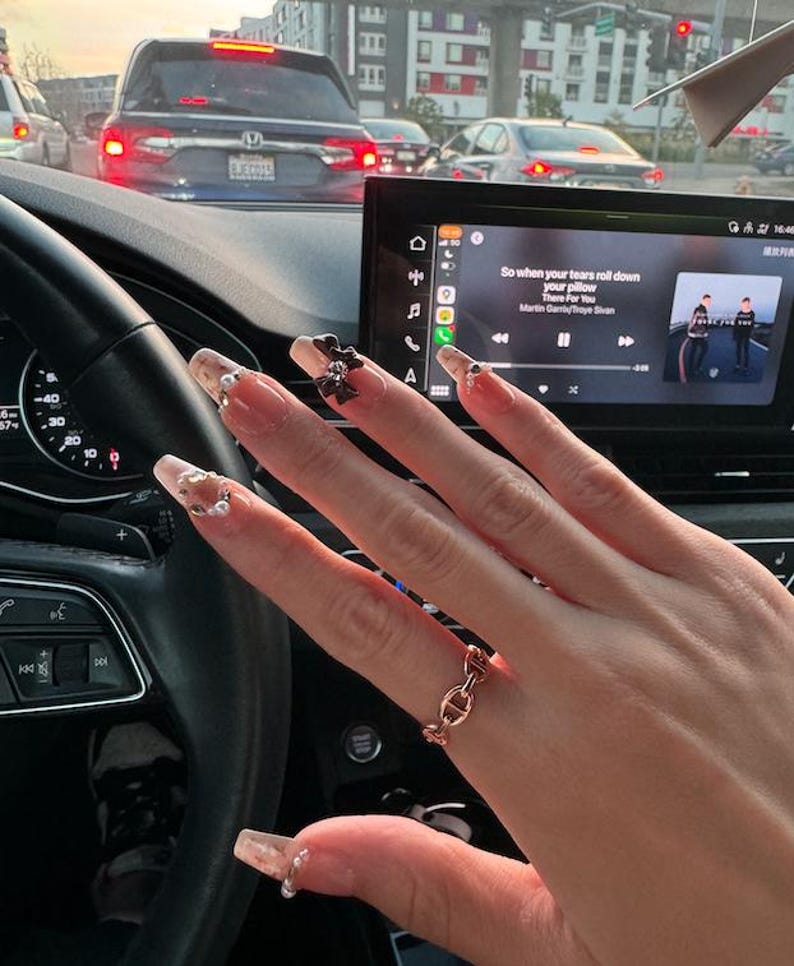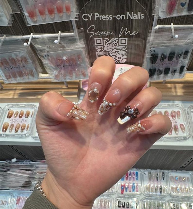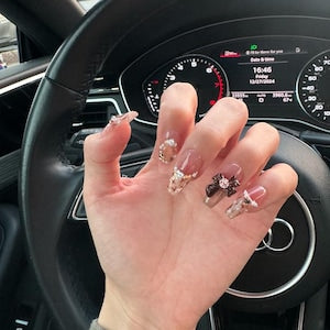 Gold Lady Brown Bows Cat Eye French Tips Coffin Shape Premium Salon-quality Reusable Handmade Press-on Nails