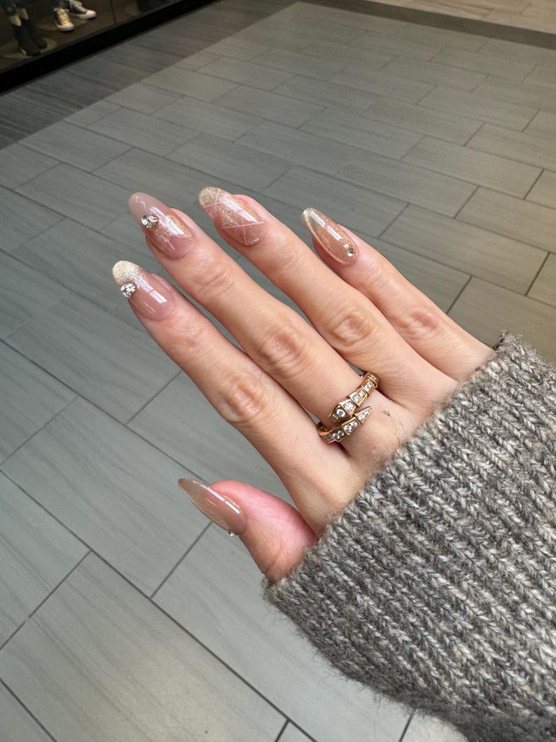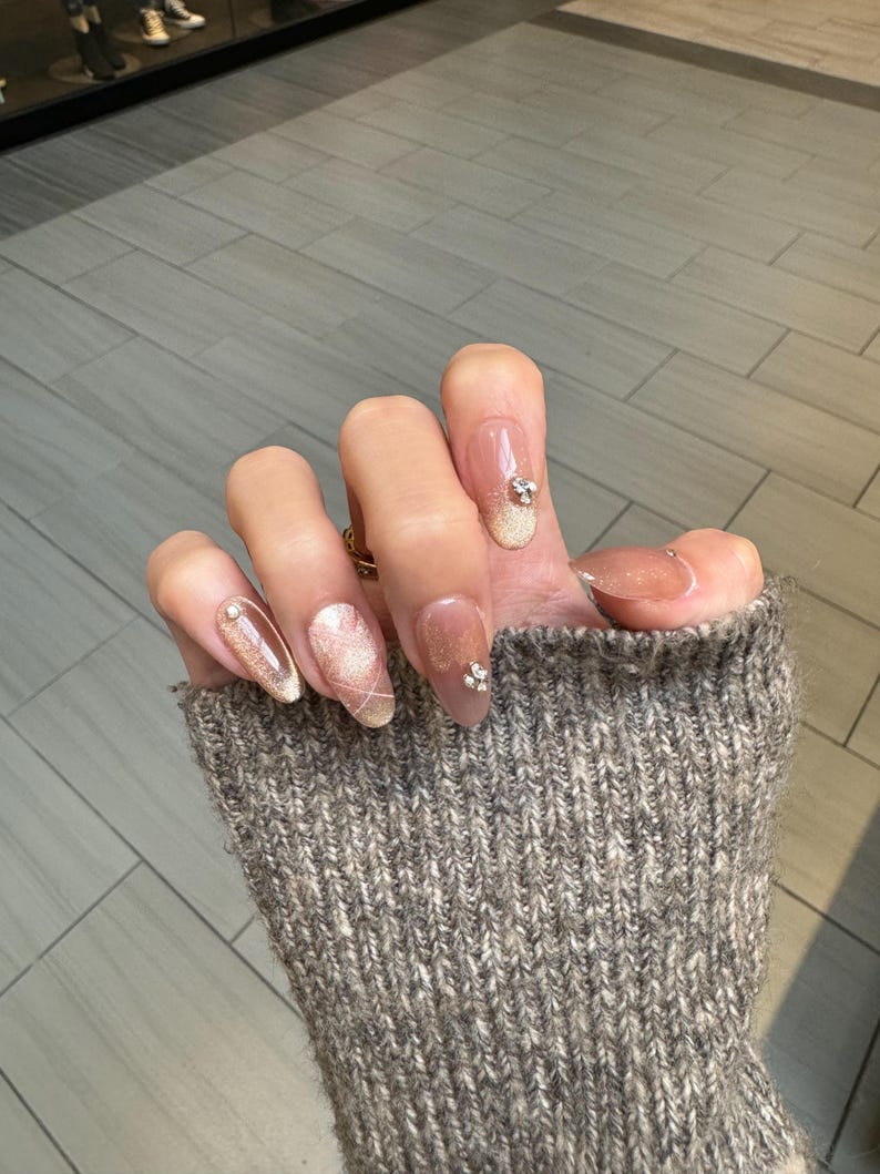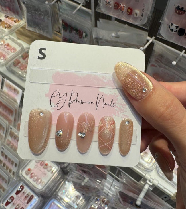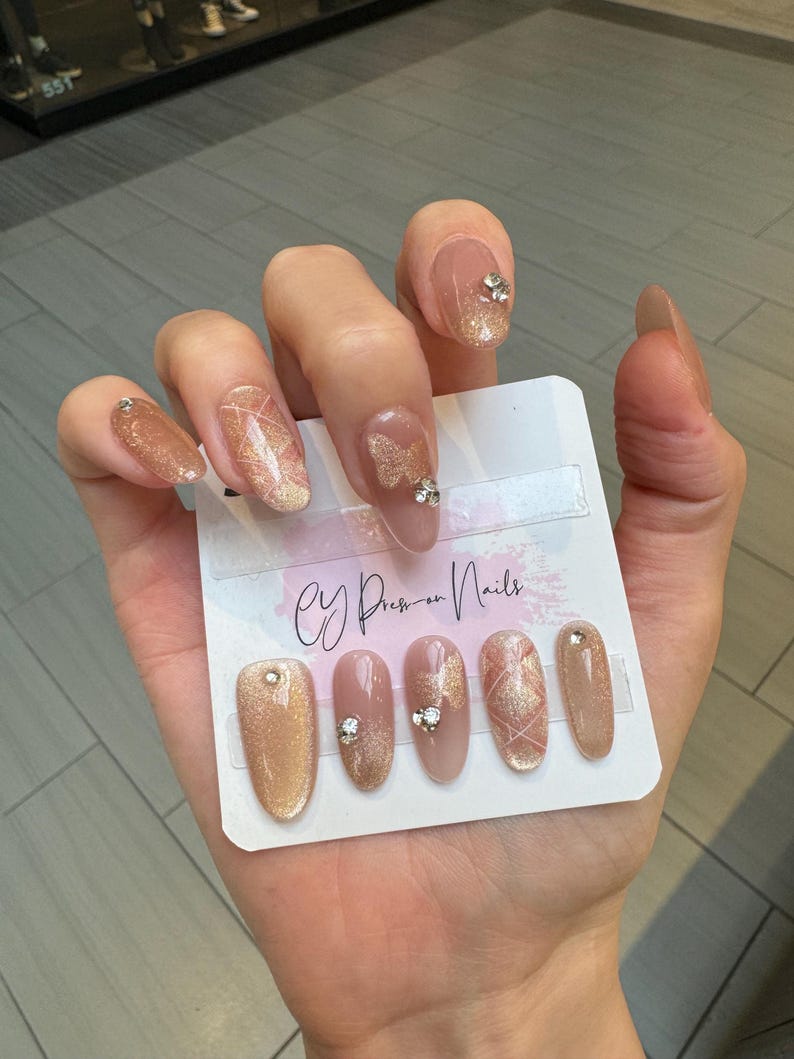 Gold Cat Eye Nails with Crystals Medium Oval Salon-quality Nails Reusable Handmade Press-on Nails
