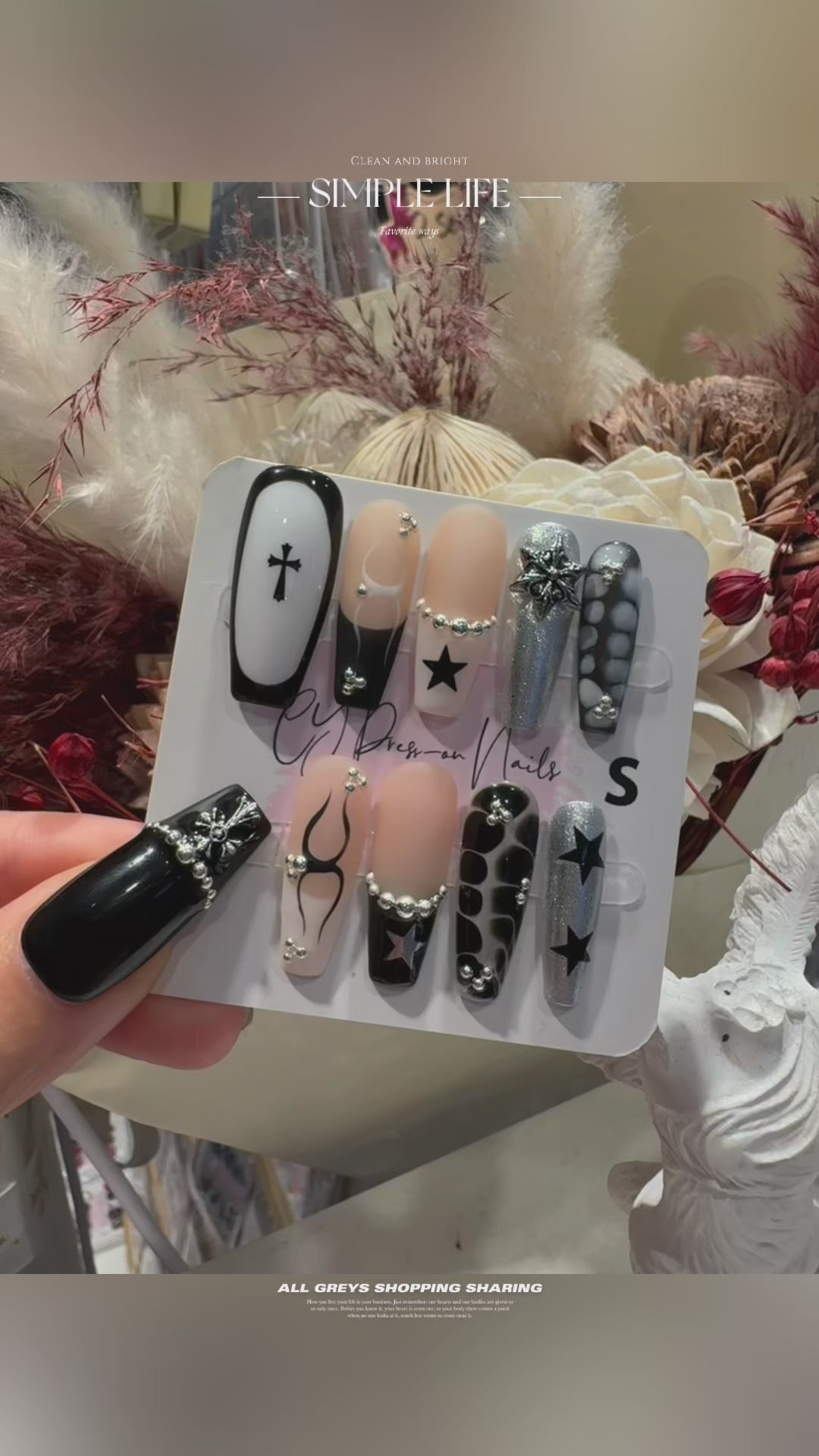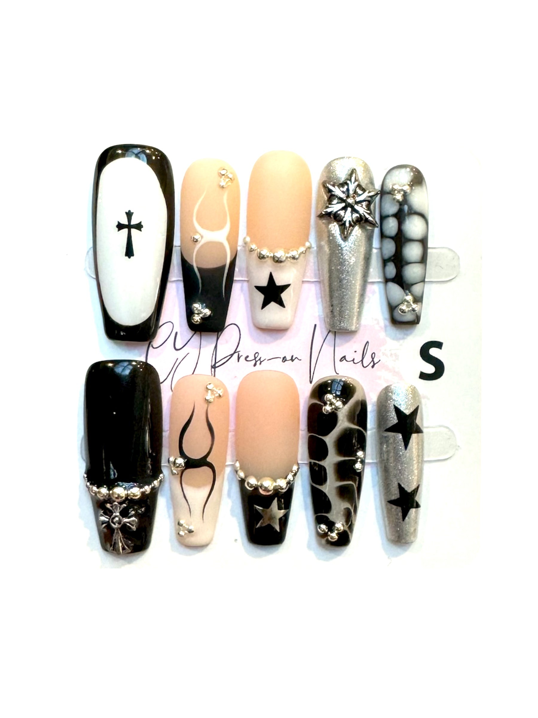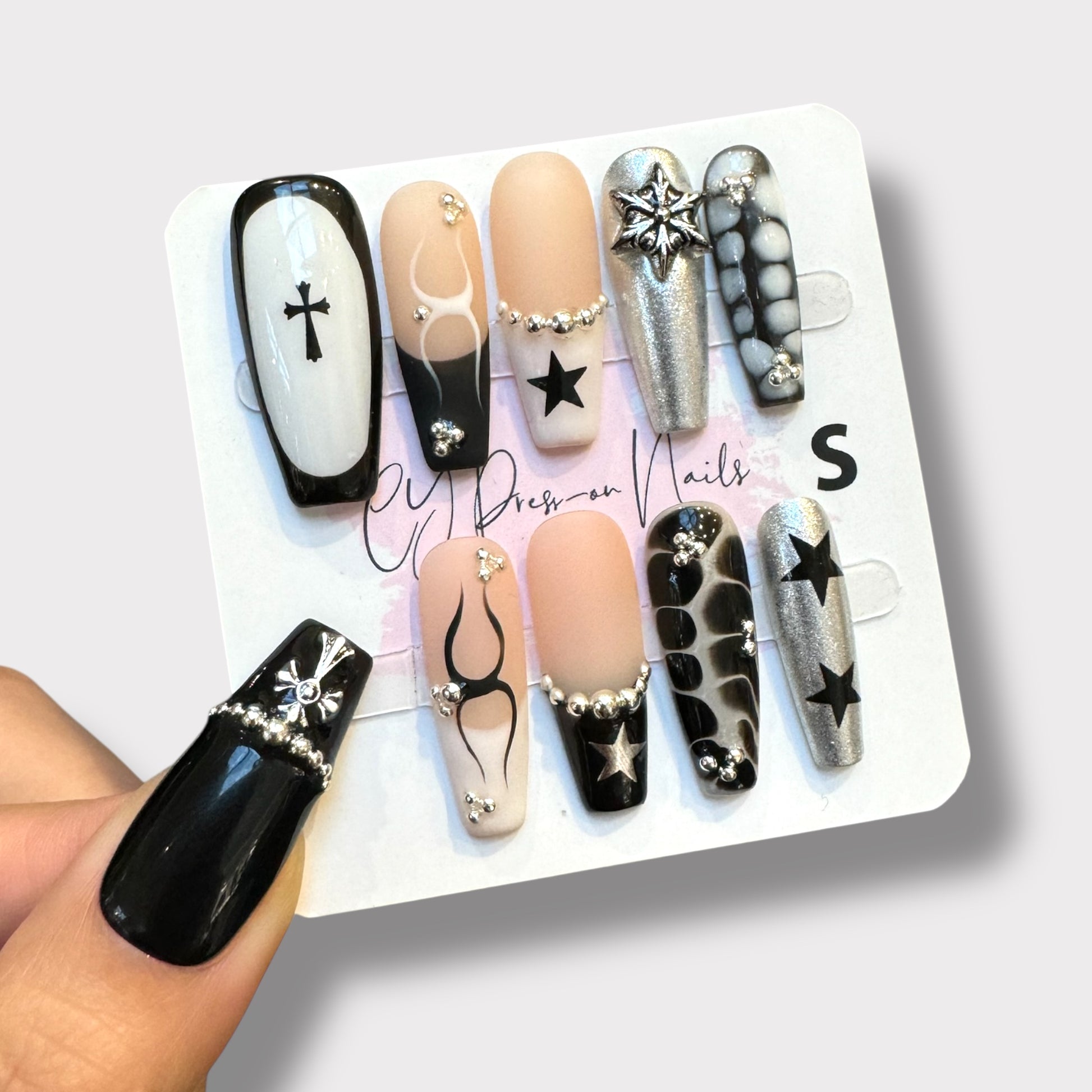 Midnight Rebel handmade press-on nails feature a bold black-and-silver palette with gothic crosses, stars, and edgy chrome accents. The mix of matte nude tones, metallic shimmer, and rhinestone details create a fierce, fashion-forward look perfect for night outs, concerts, or statement styles. Elevate your look with this rock-glam nail design.