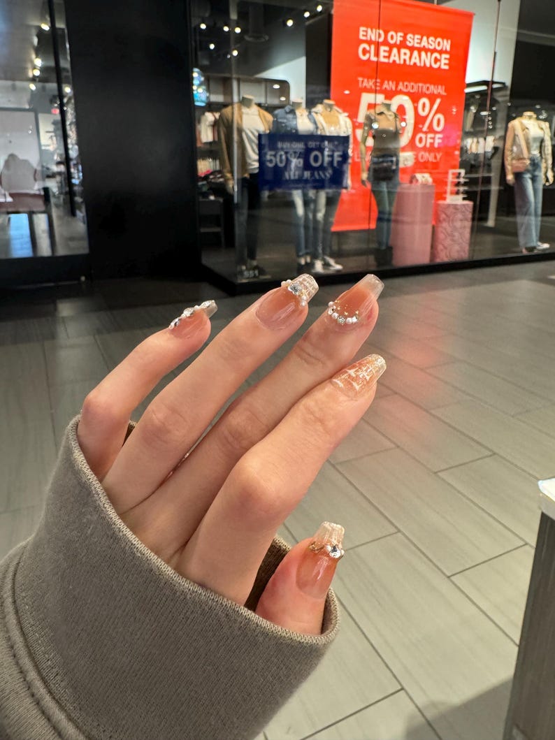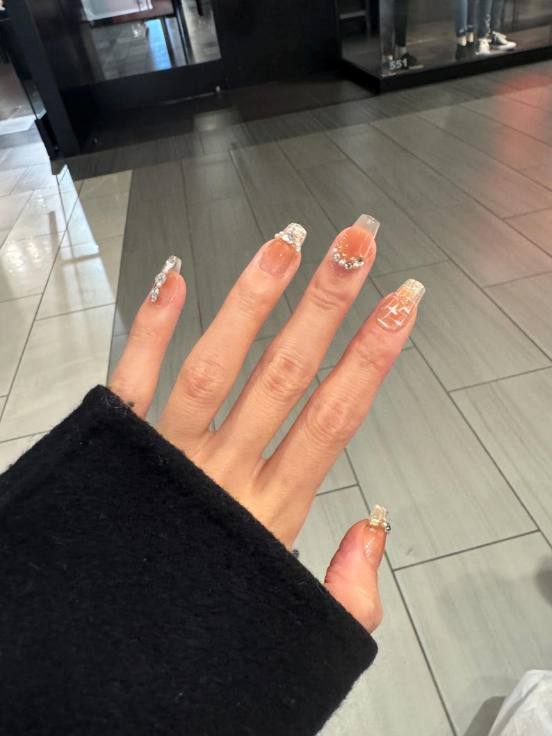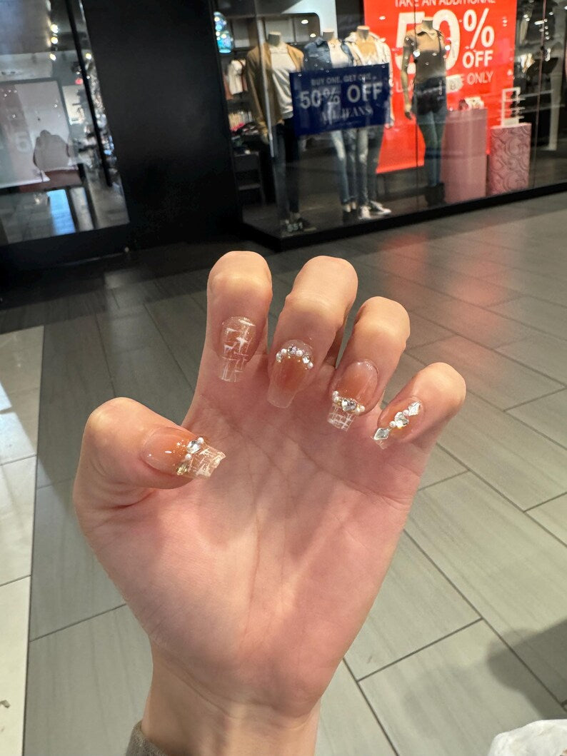 Peach Orange Blush Color Short Coffin Nails French Tips Tweed Style with Crystals Girly Reusable Salon-quality Handmade Press-on Nails