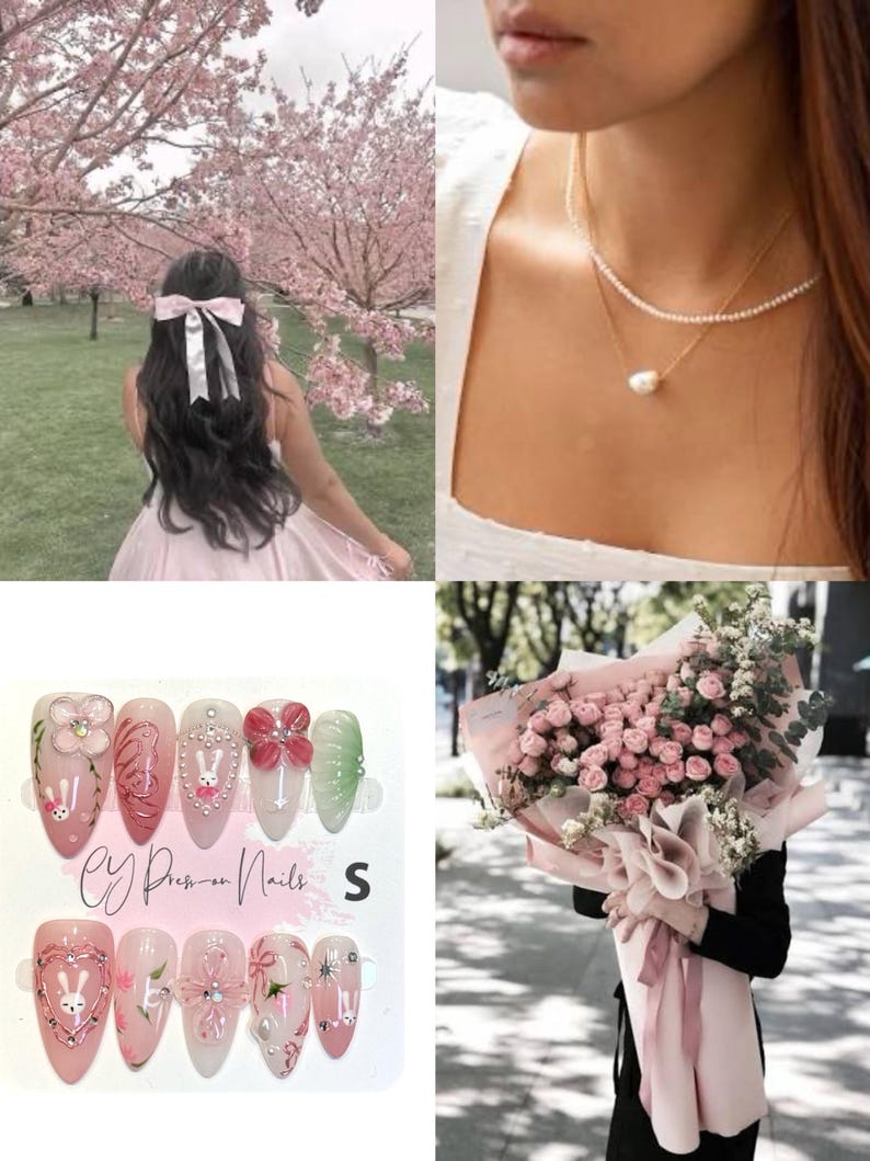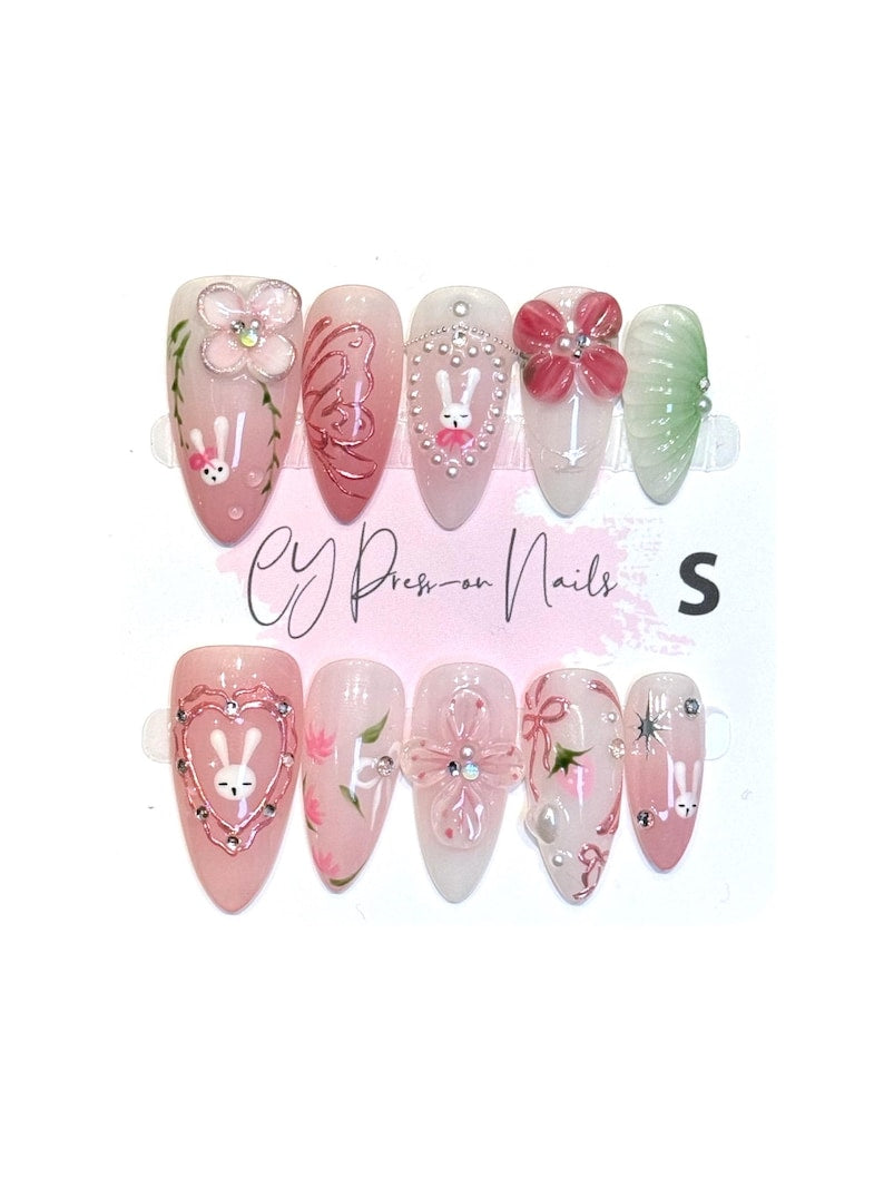 Pink Bunny & Butterfly Garden Press-On Nails – Floral Design, Medium Almond Shape | Premium Quality, Handmade, Reusable, Salon-Style, Spring
