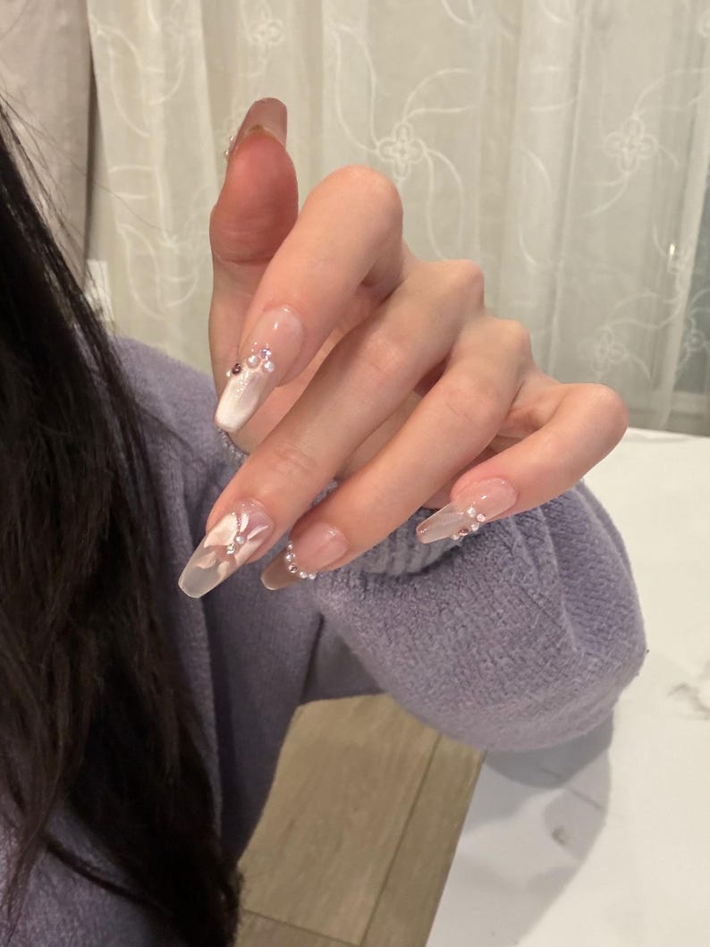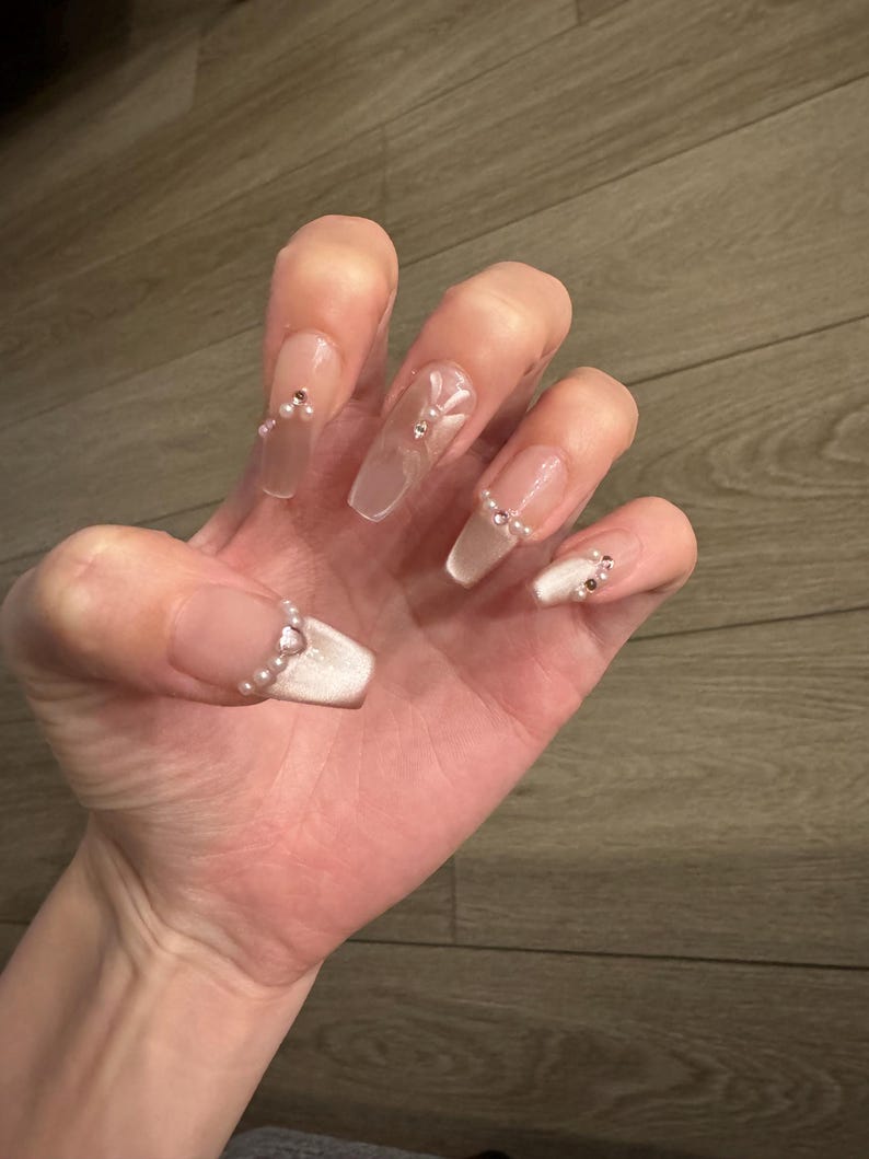 Pink Butterfly Pearl Cat Eye Nails Shiny French Tips