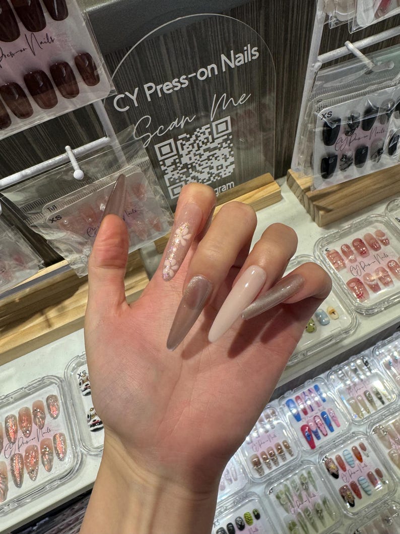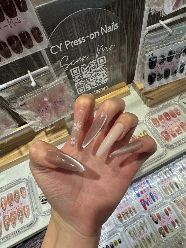 Pink Cat Eye with Little Flowers Extra Long Almond Stitello Premium Salon-quality Reusable Handmade Press-on Nails