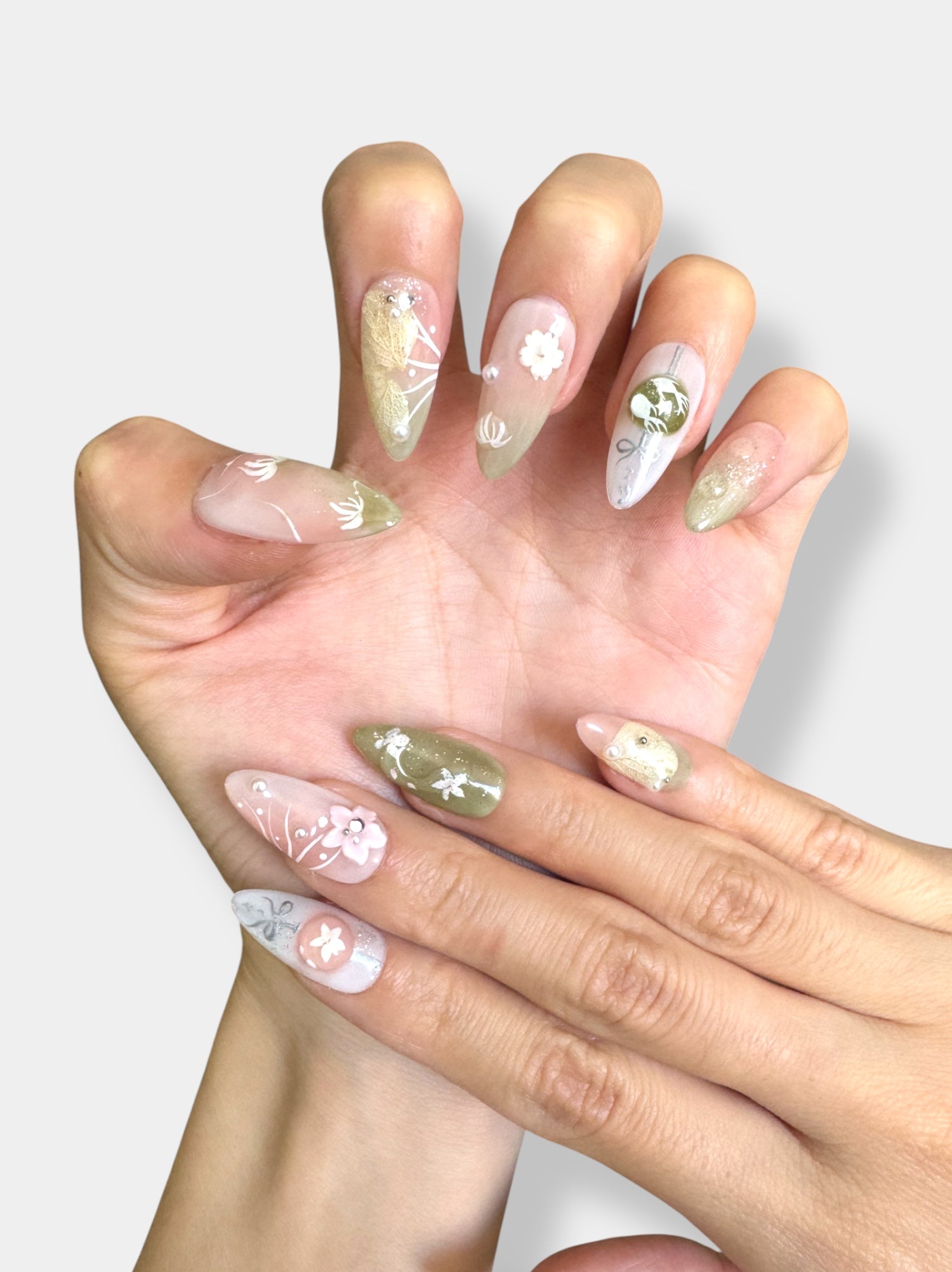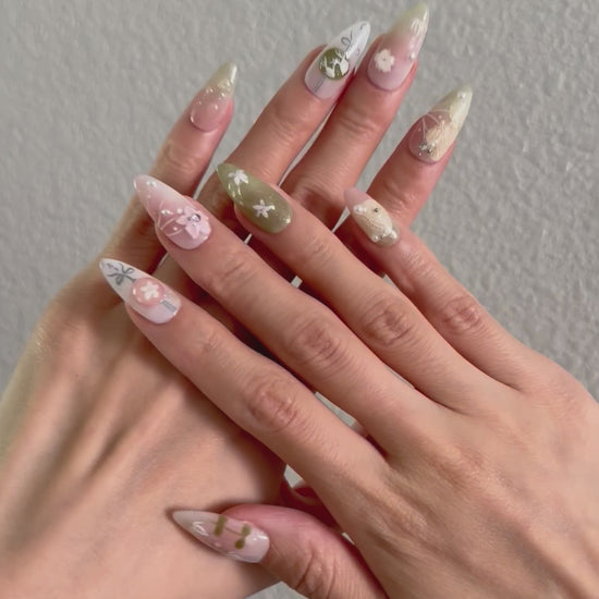 Pink with Green Water Lily Short Almond Salon-quality Reusable Handmade Press-on Nails