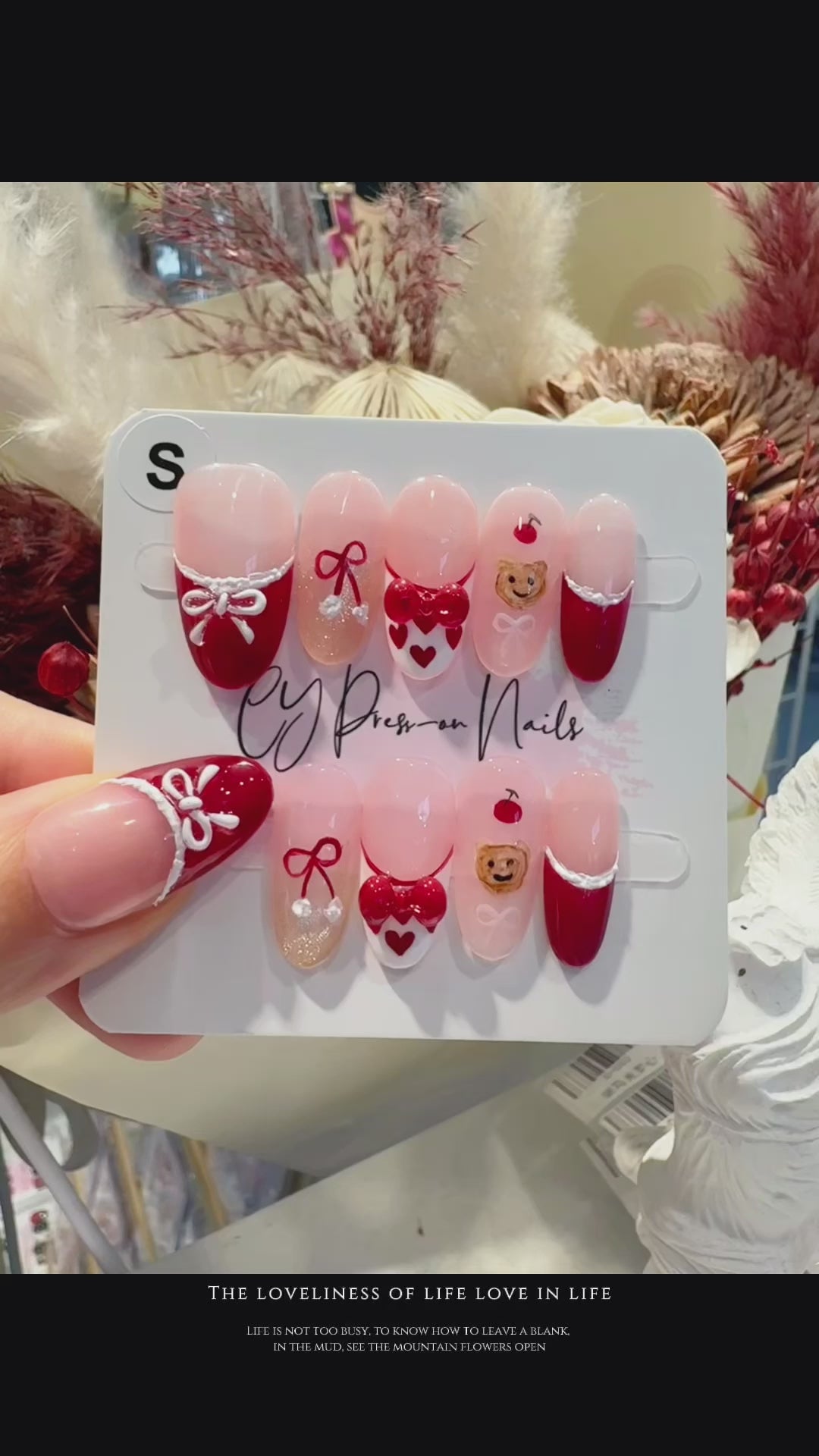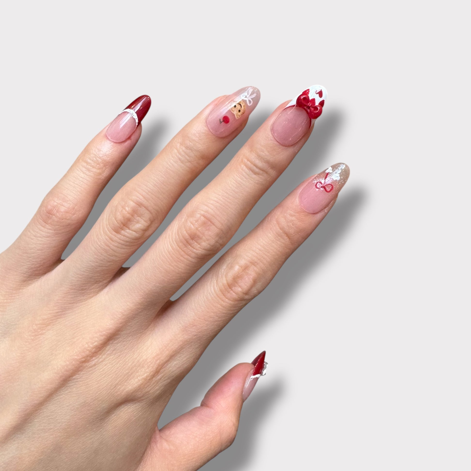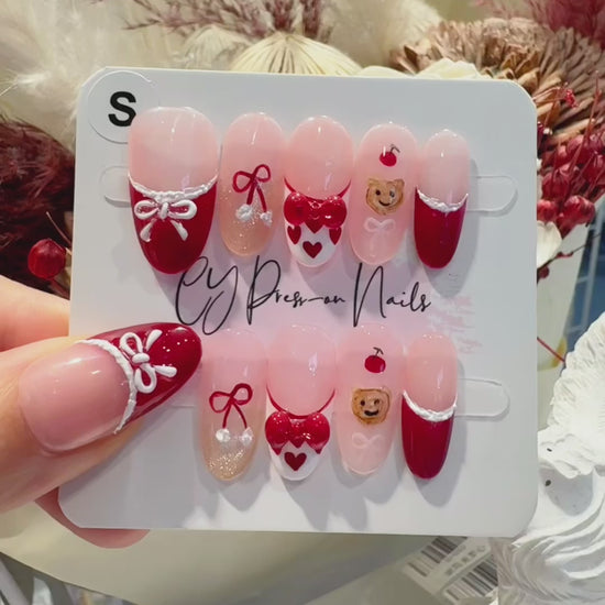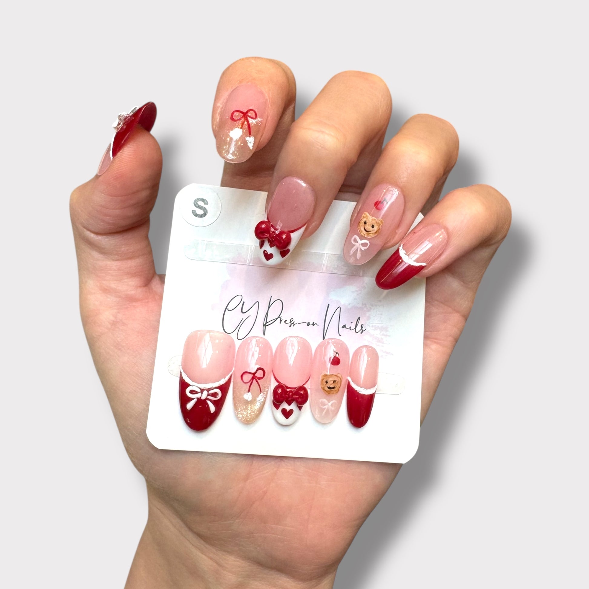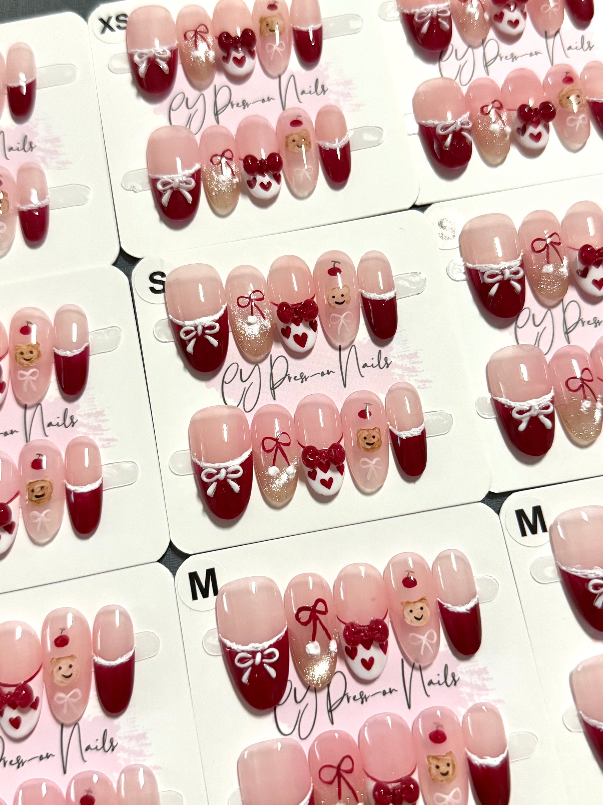 Adorable handmade press-on nails featuring a charming New Year's theme with cherry, teddy bear, and bow accents. This romantic nail set includes deep burgundy, soft pink, and nude shades with white French tips and delicate drip details.