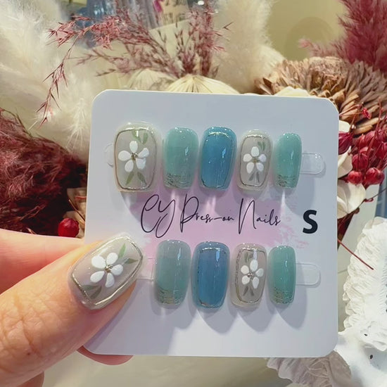 A calming sage and dusty-blue press-on nail set featuring hand-painted white florals framed with soft gold accents. The gradient mix of green and blue adds a fresh, natural vibe—perfect for spring, minimal aesthetics, or anyone who loves soft botanical designs. Handcrafted with a glossy finish for an elegant, everyday look.