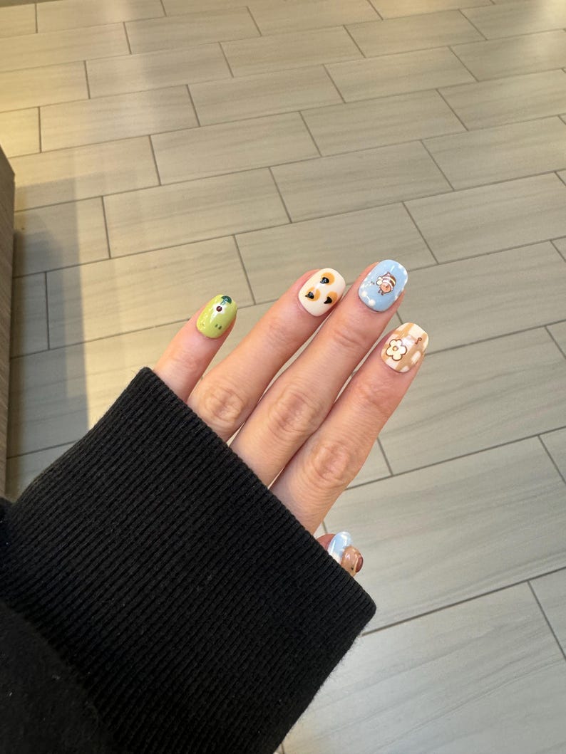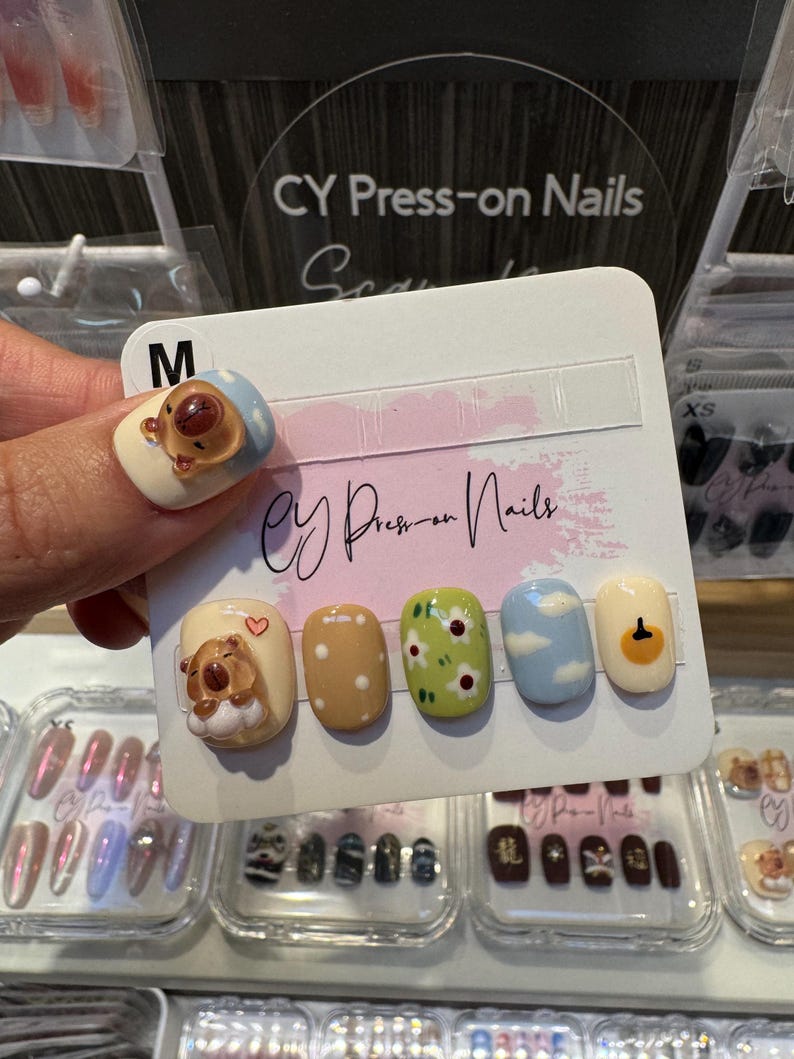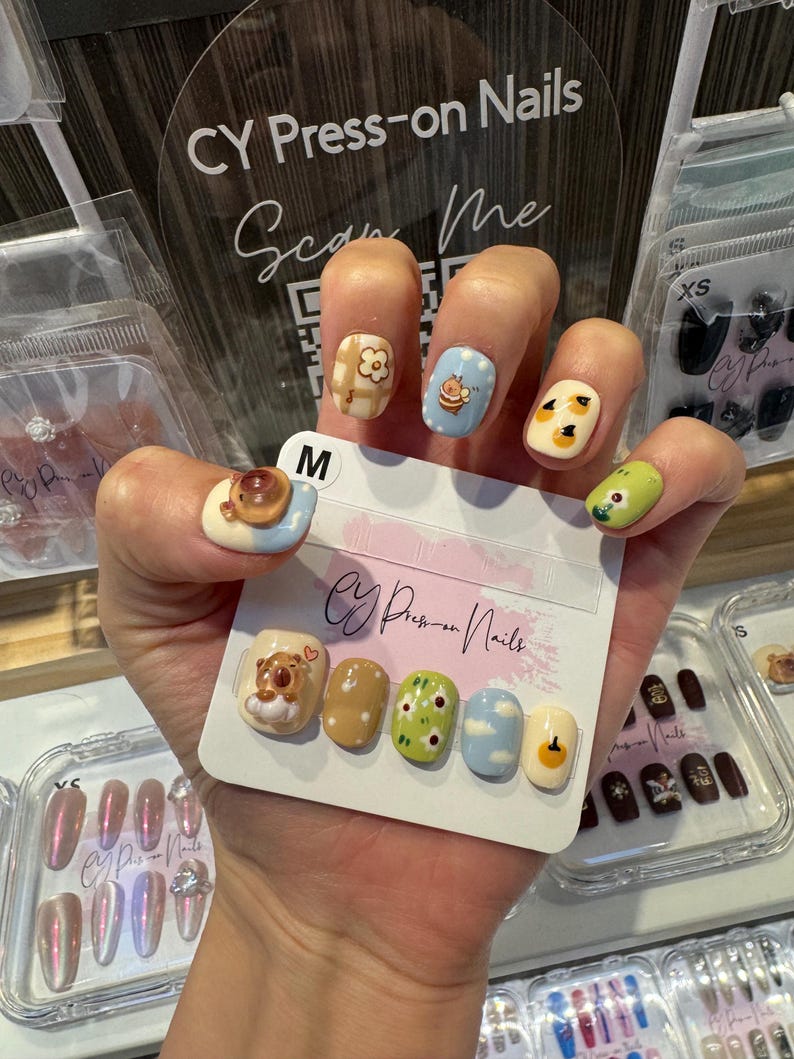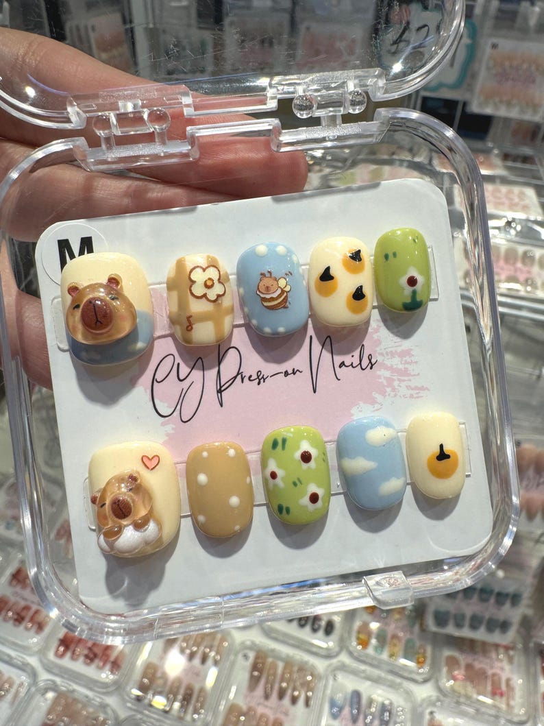 Summer Capybara with the Bees Extra Short Round Cartoon Cute Handpainting Salon-quality Reusable Handmade Press-on Nails