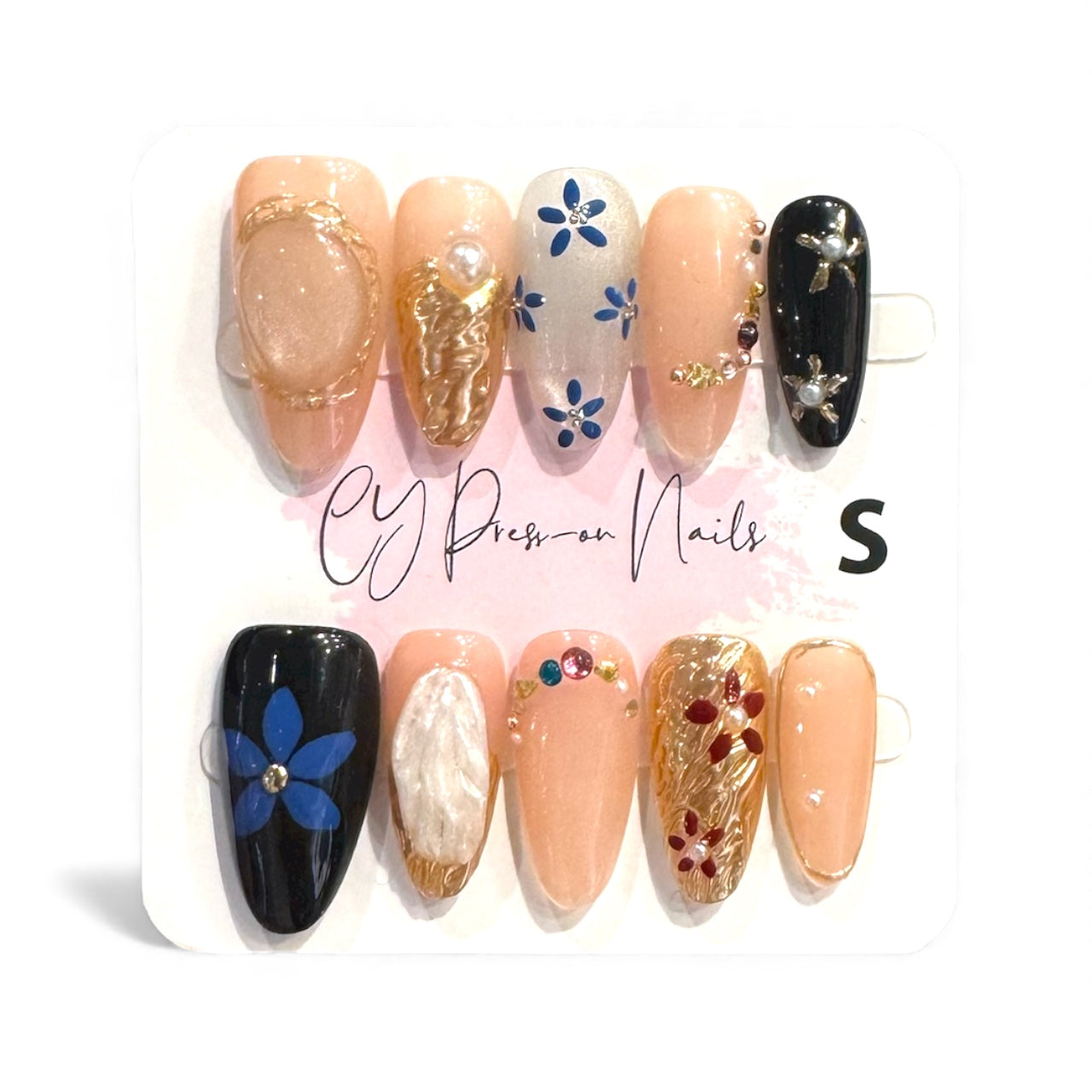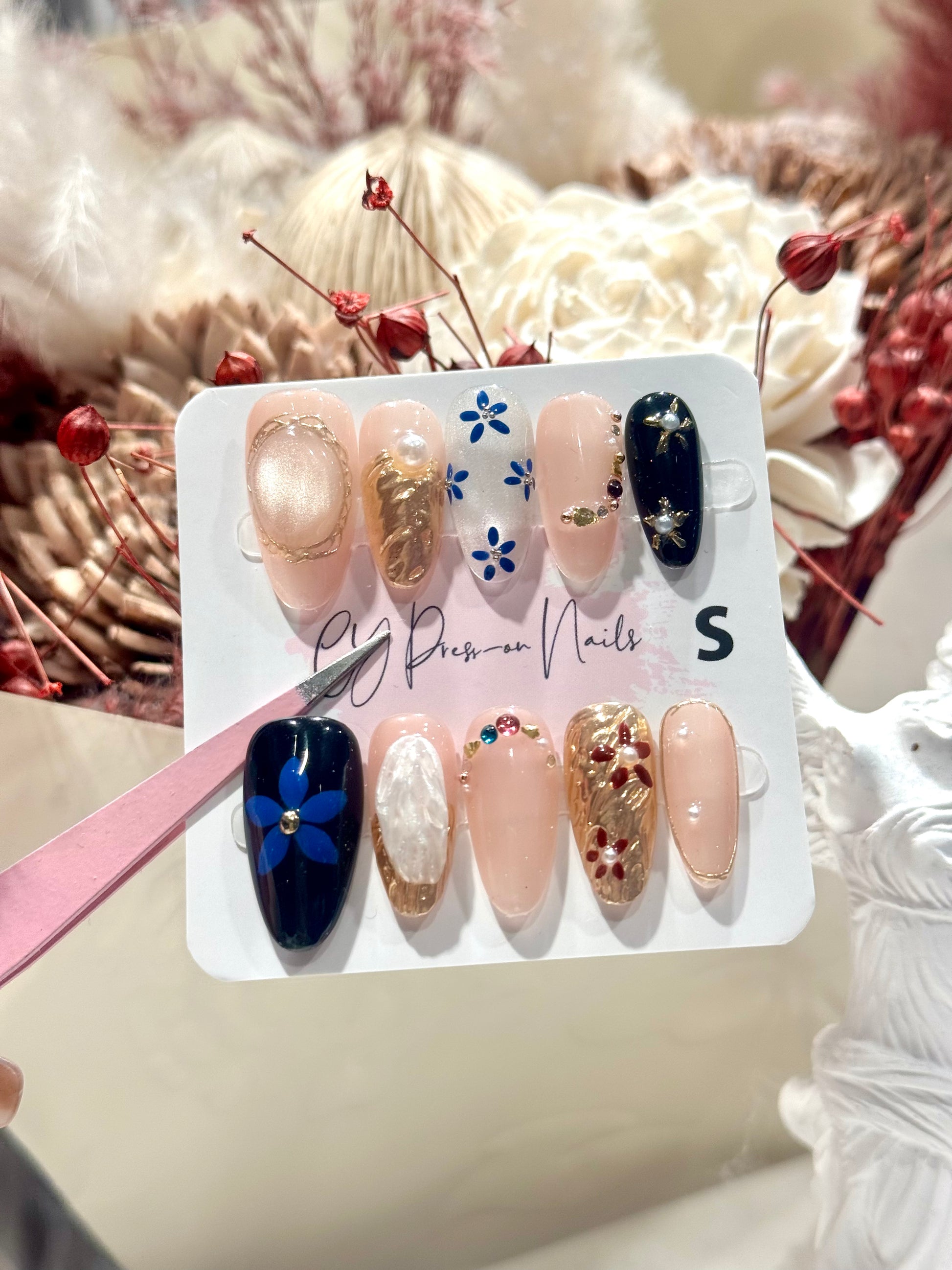 Blue and Gold Floral Press-On Nails with Pearl and Crystal Cat Eye Handpainting 3D Design