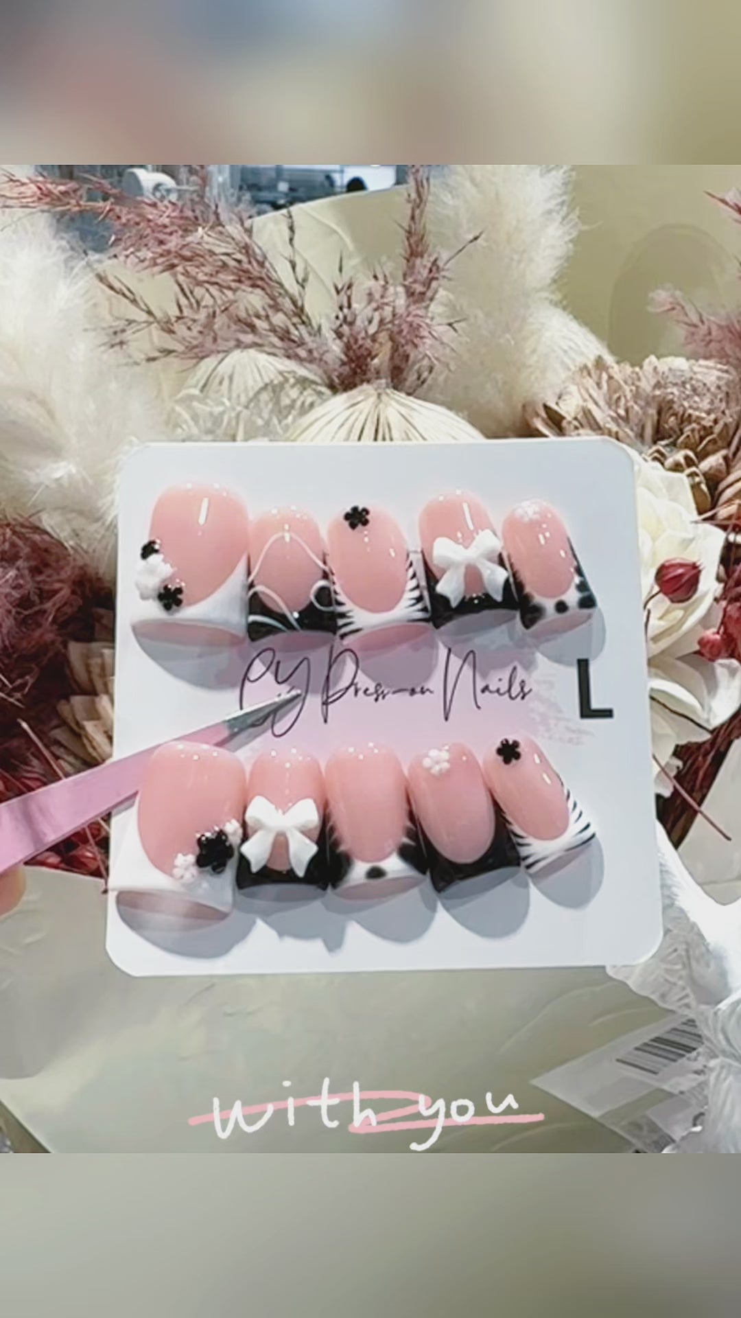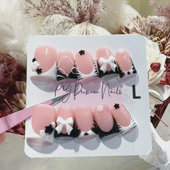 Black and White Style with Bow and Flower 3D Charms in Duck Nails