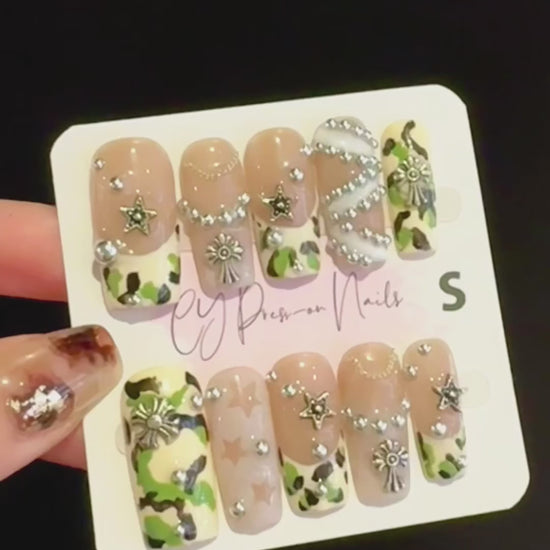 3D Green Camouflage Y2K Stylish French Tips Nails with mini Steel Balls Chains Cross Star Charm