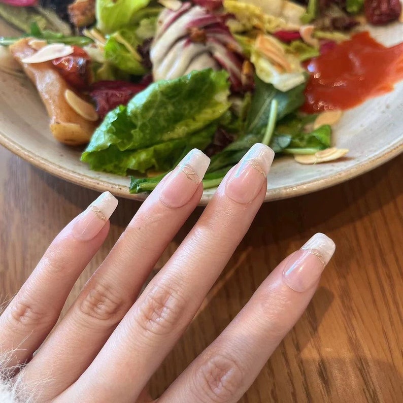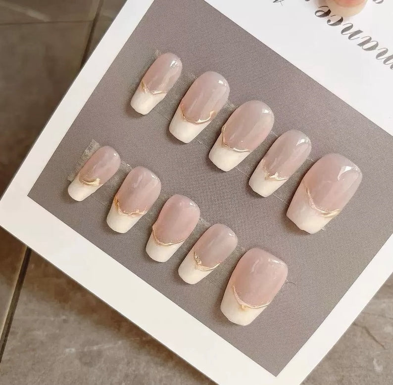 Thread White French Tips Short Coffin Premium Salon-quality Handmade Reusable Press-on Nails with Free Tool Kit