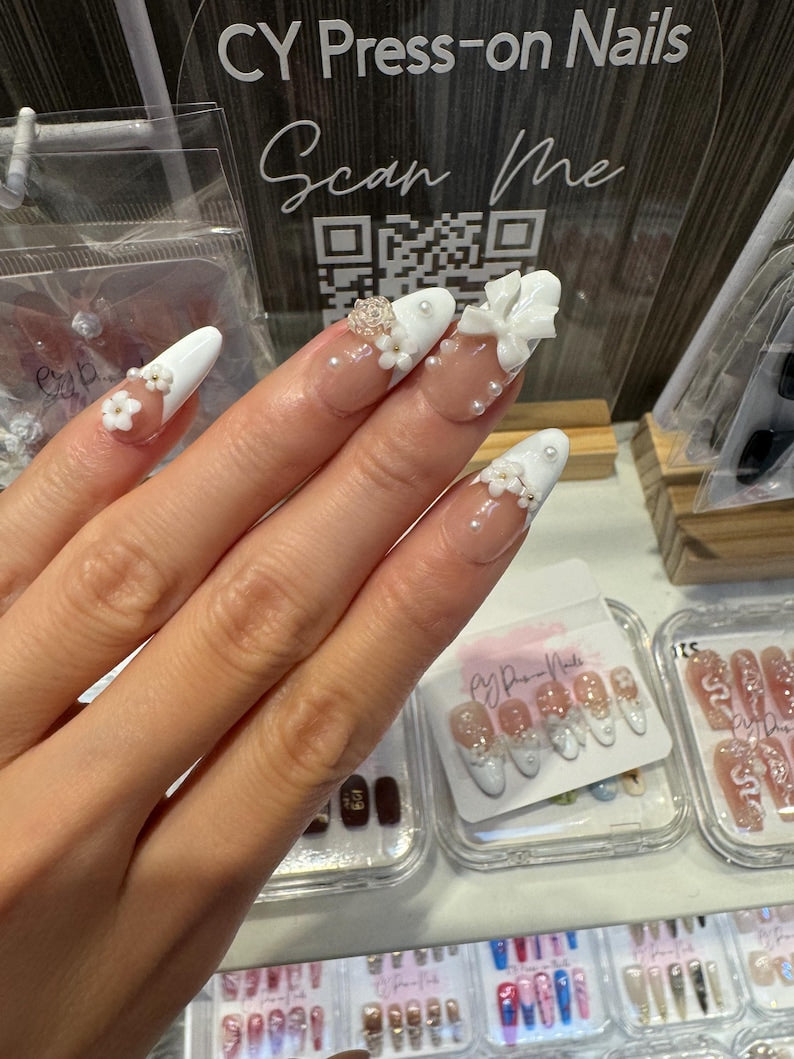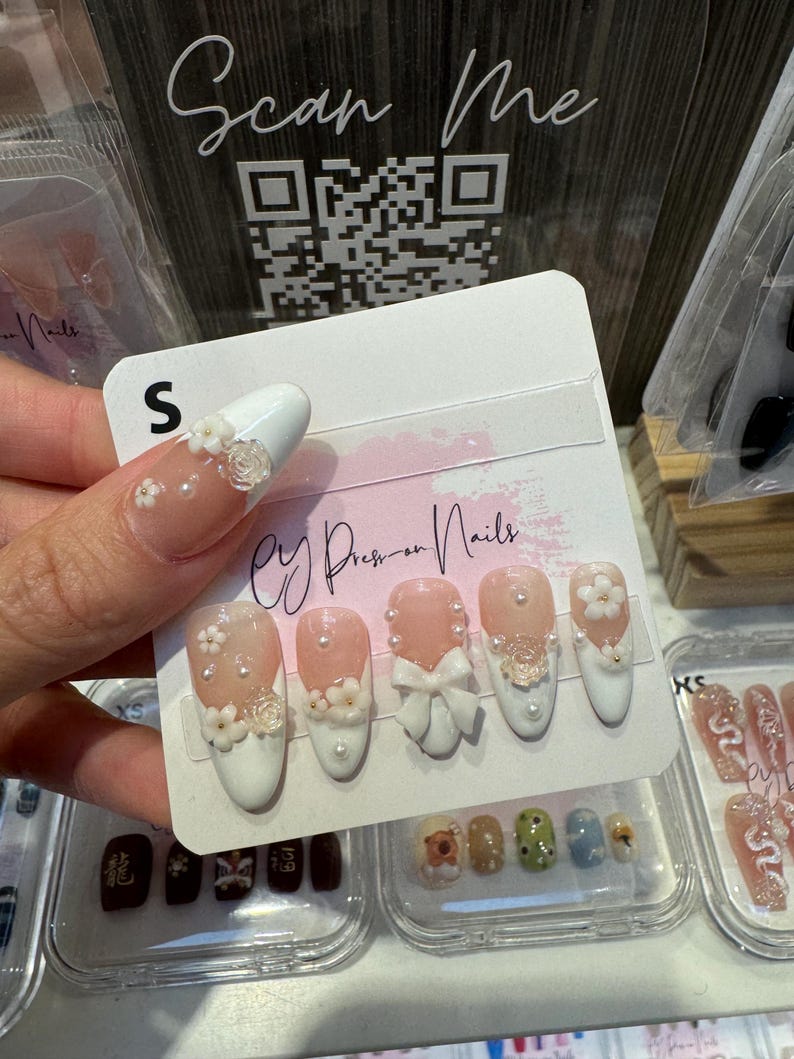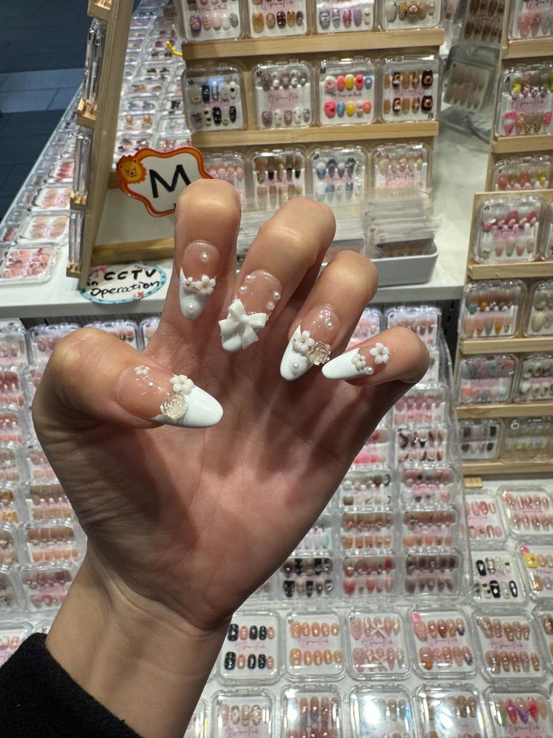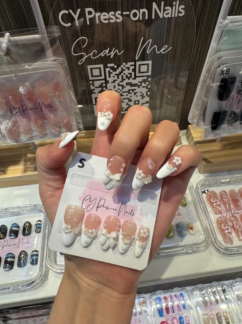 Wedding Anniversary White 3D Flowers with Bows and Pearls Medium Oval Almond Salon-quality Reusable Handmade Press-on Nails